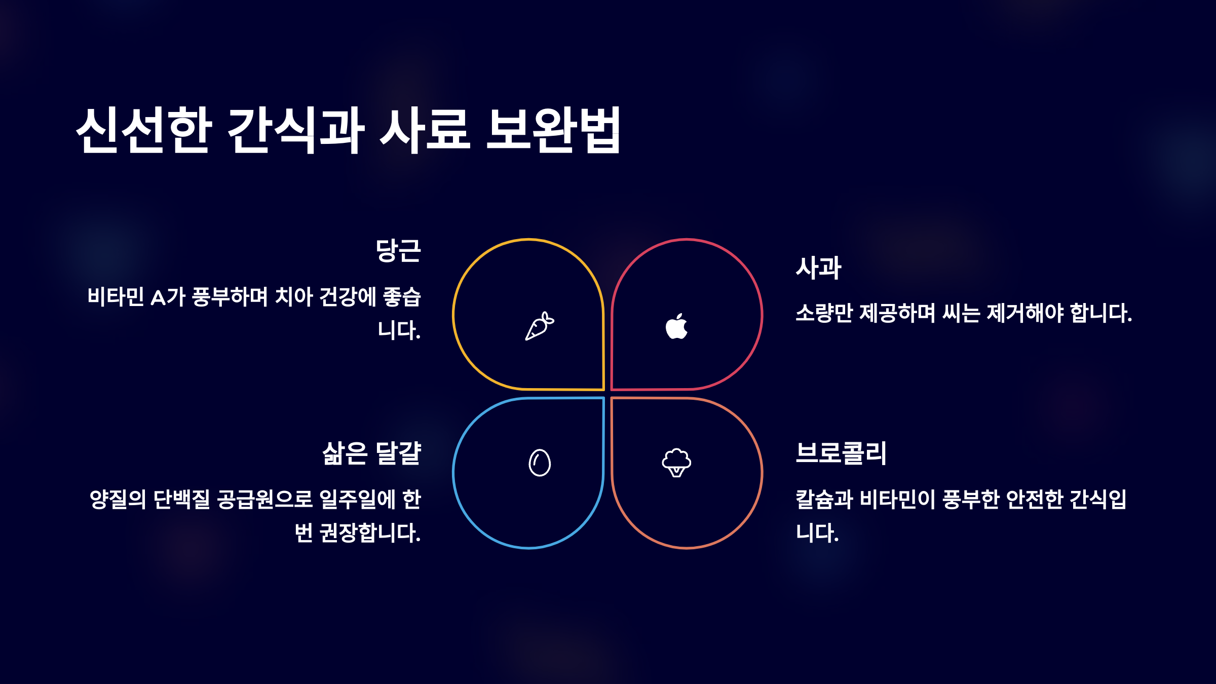 A1. 기본은 사료지만, 신선한 채소나 간식을 소량 추가하면 더 좋아요. 단, 균형 잡힌 급여가 필요해요.