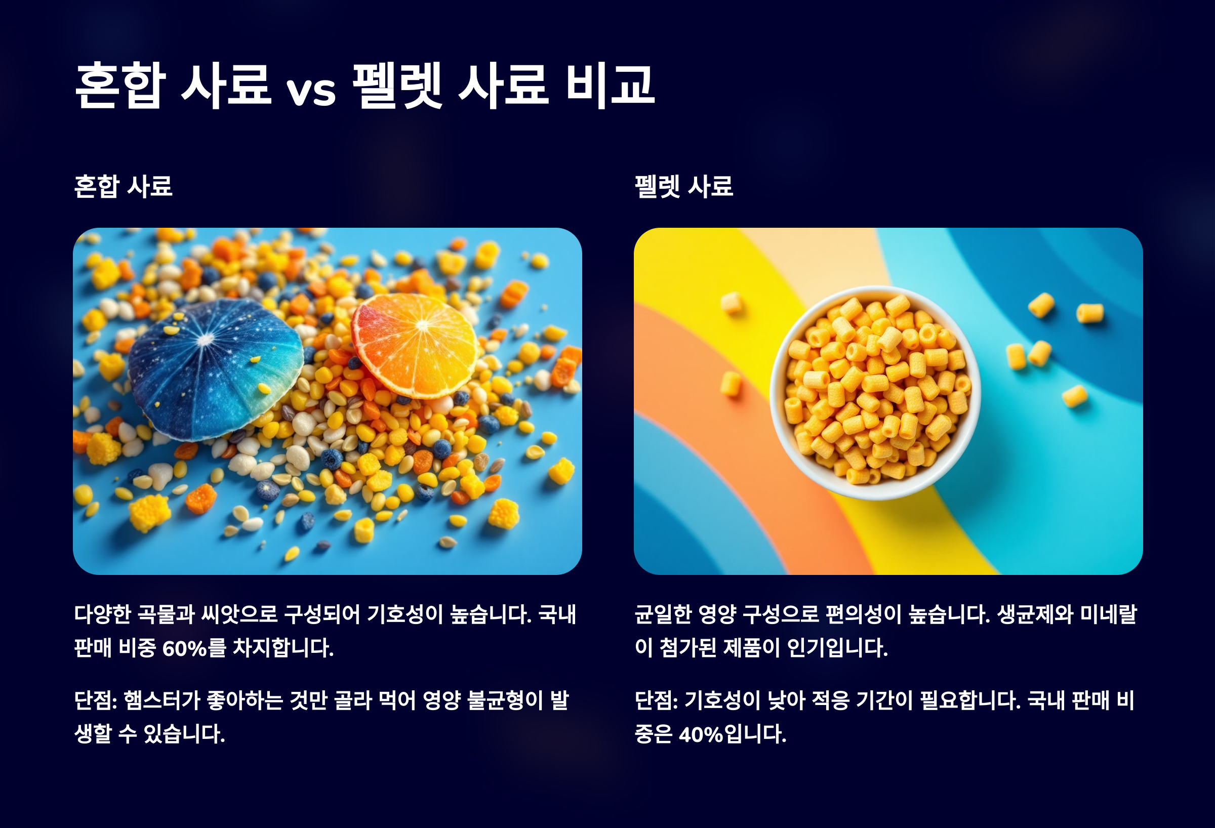 햄스터 사료는 크게 혼합 사료와 펠렛 사료로 나눌 수 있어요. 각 사료는 장단점이 뚜렷해서 햄스터 성향과 건강 상태에 따라 선택하는 것이 좋아요. 🐹