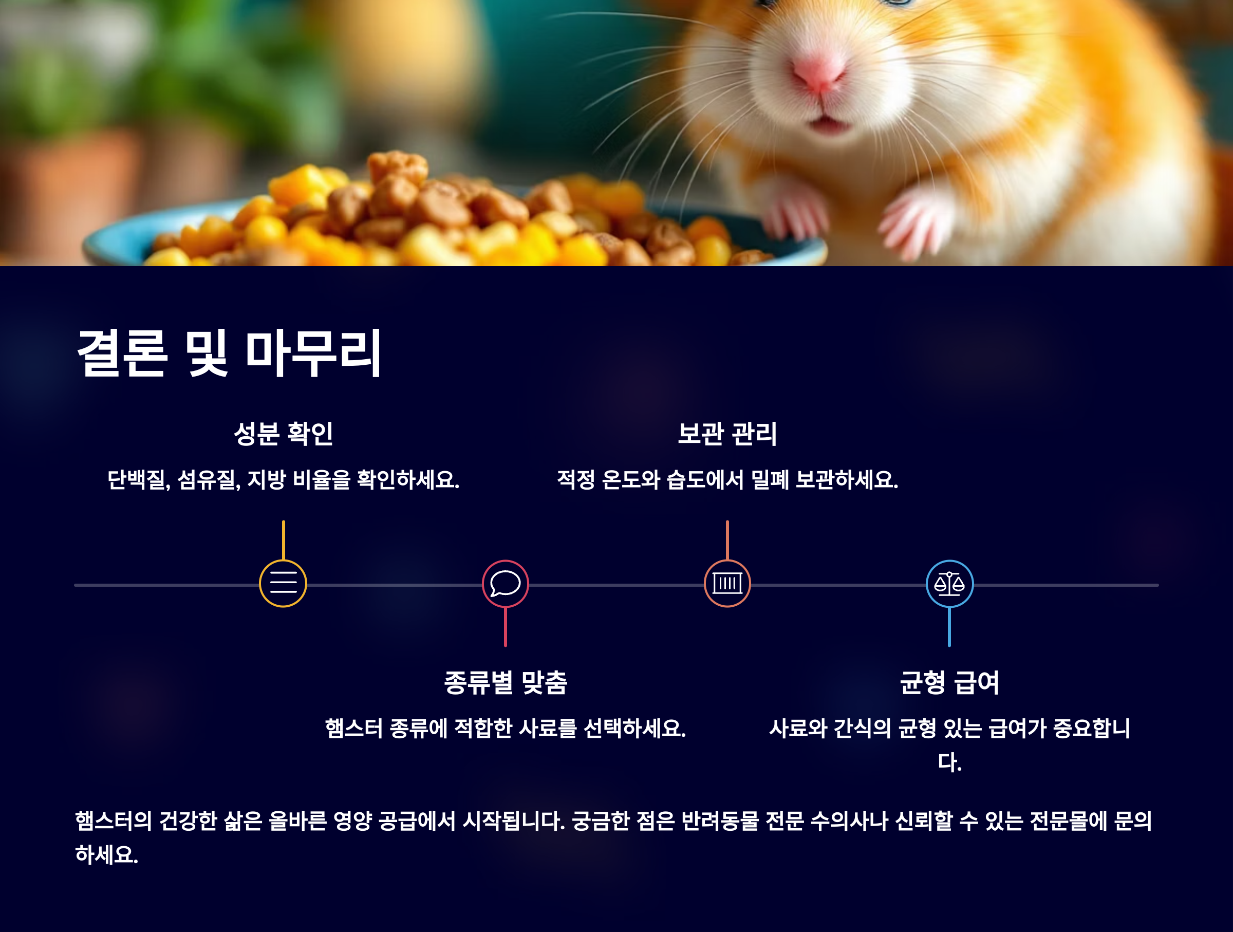 햄스터 건강을 지키기 위해선 성분 비율을 꼭 확인하고, 단백질-지방-섬유질이 균형 잡힌 사료를 선택하는 것이 가장 중요해요. 📋 소중한 우리 햄스터를 위한 최고의 선택, 꼼꼼히 따져봐야 해요!