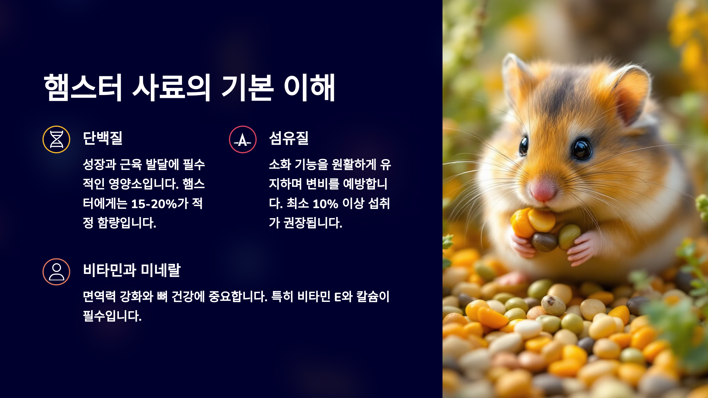 햄스터 건강을 지키기 위해선 성분 비율을 꼭 확인하고, 단백질-지방-섬유질이 균형 잡힌 사료를 선택하는 것이 가장 중요해요. 📋 소중한 우리 햄스터를 위한 최고의 선택, 꼼꼼히 따져봐야 해요!