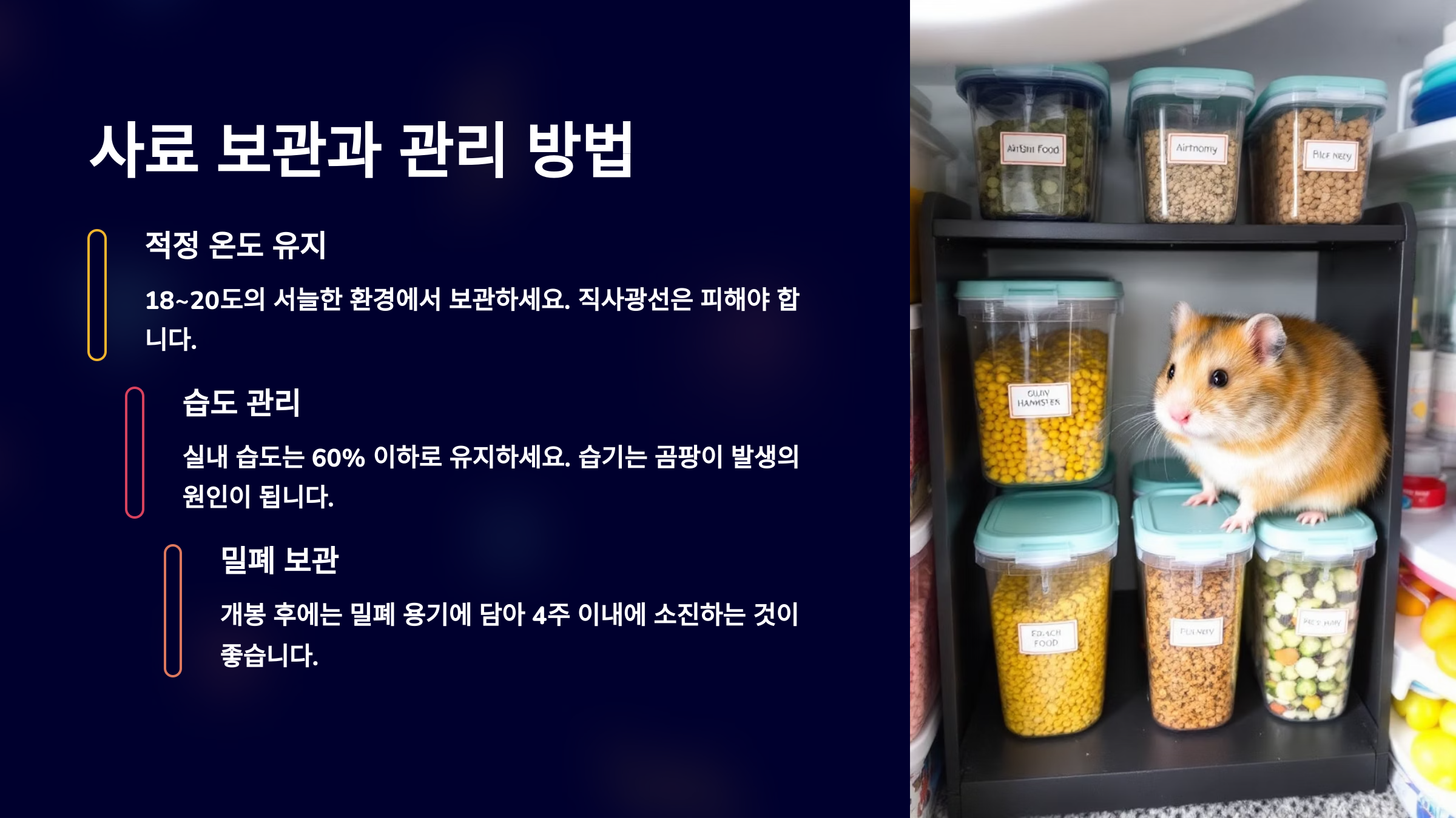 신선한 사료를 제대로 보관하는 것도 햄스터를 향한 큰 사랑이에요. 💖 작은 습관이 햄스터의 건강을 지켜줄 수 있다는 걸 꼭 기억해요!