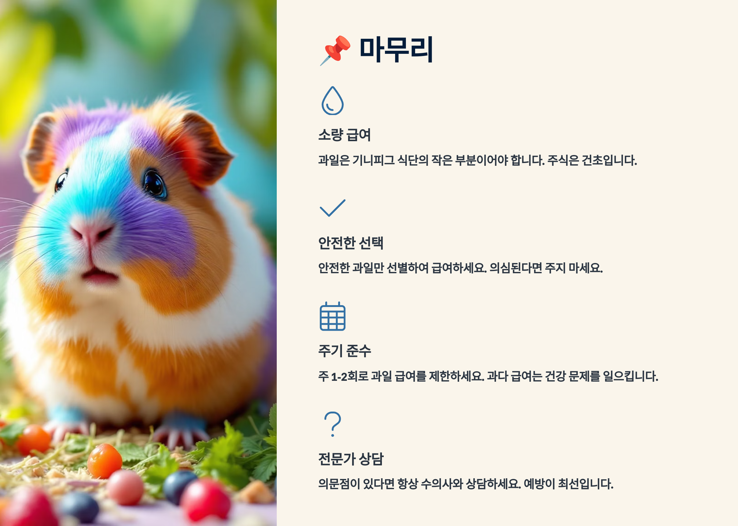 🍏 과일은 기니피그의 영양 보충과 기분 전환에 좋은 도구가 될 수 있어요. 다만 과일이 주식이 되어선 안 되고, 항상 건초 중심, 채소 보조, 과일은 간식이라는 식단 원칙을 잊지 않아야 해요.