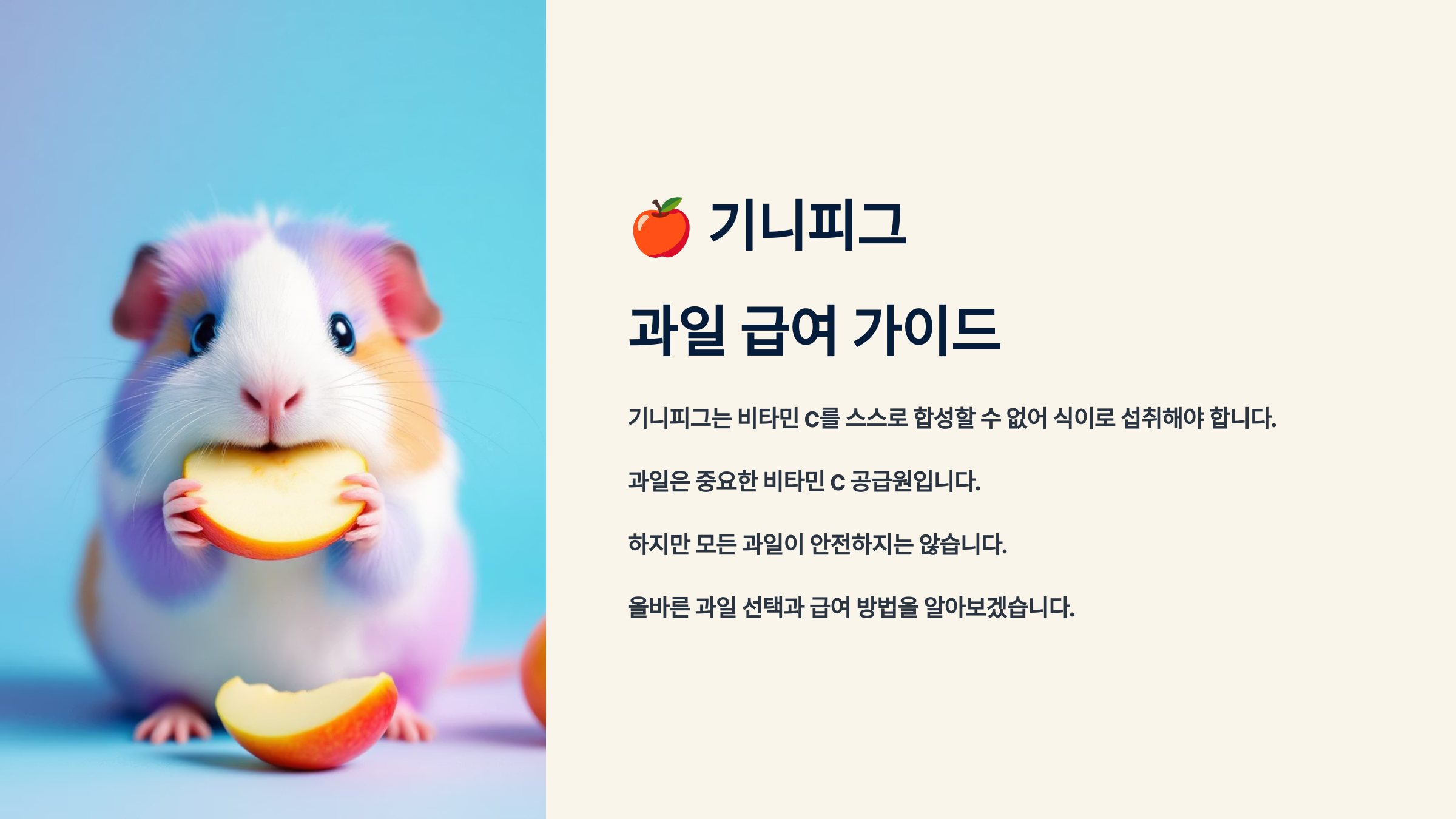 🧃 과일 급여는 단순히 주는 것보다도, 급여 전 준비와 급여 후 반응 확인이 더 중요해요. 귀여운 기니피그를 위해 한 조각의 과일까지 신중하게 챙겨보자구요!