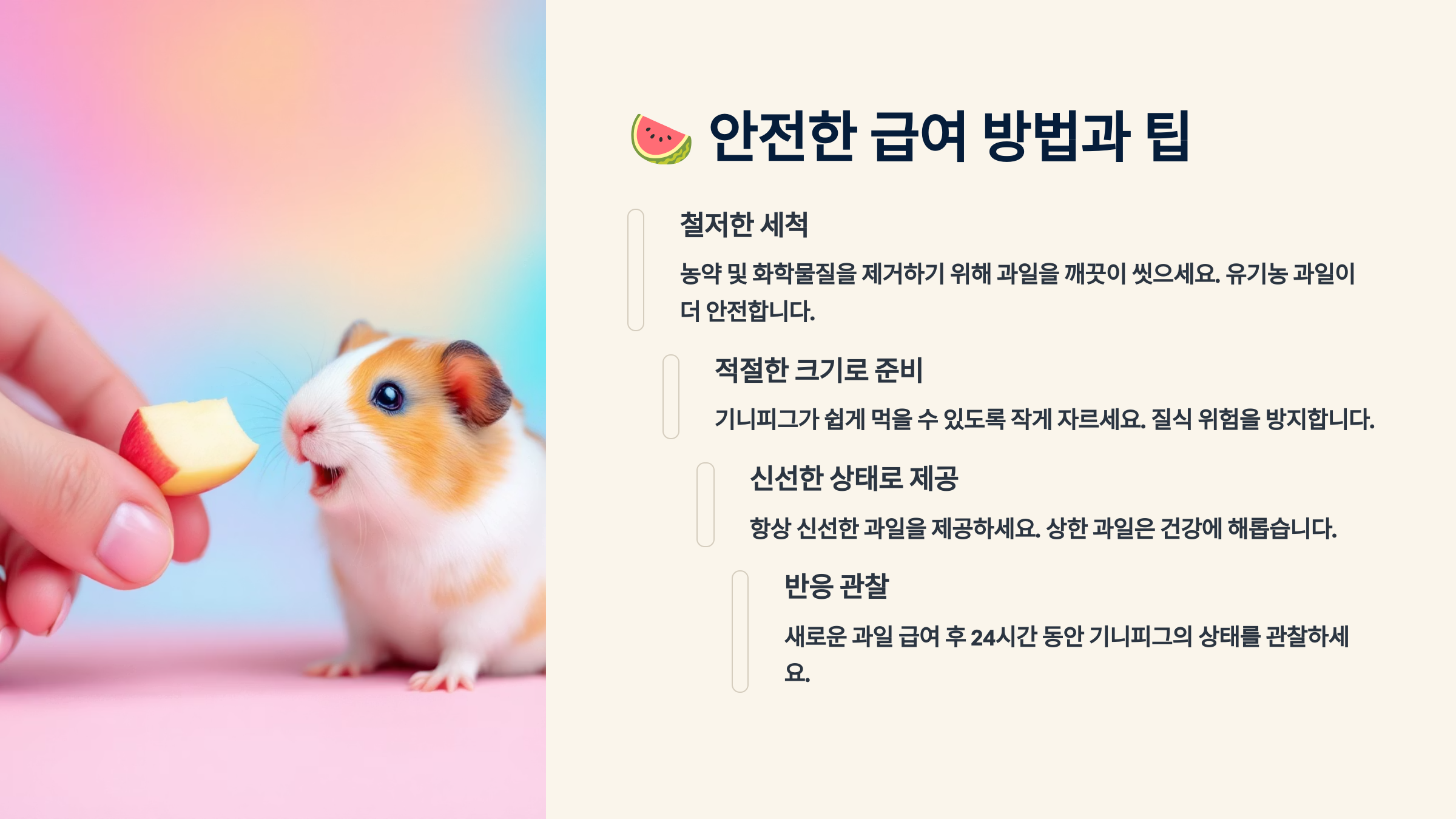 🧺 과일은 기니피그에게 소중한 간식이지만, 급여 전 반드시 기본적인 위생과 급여법을 지켜야 해요. 아무리 좋은 과일이라도 잘못 급여하면 오히려 건강을 해칠 수 있답니다.