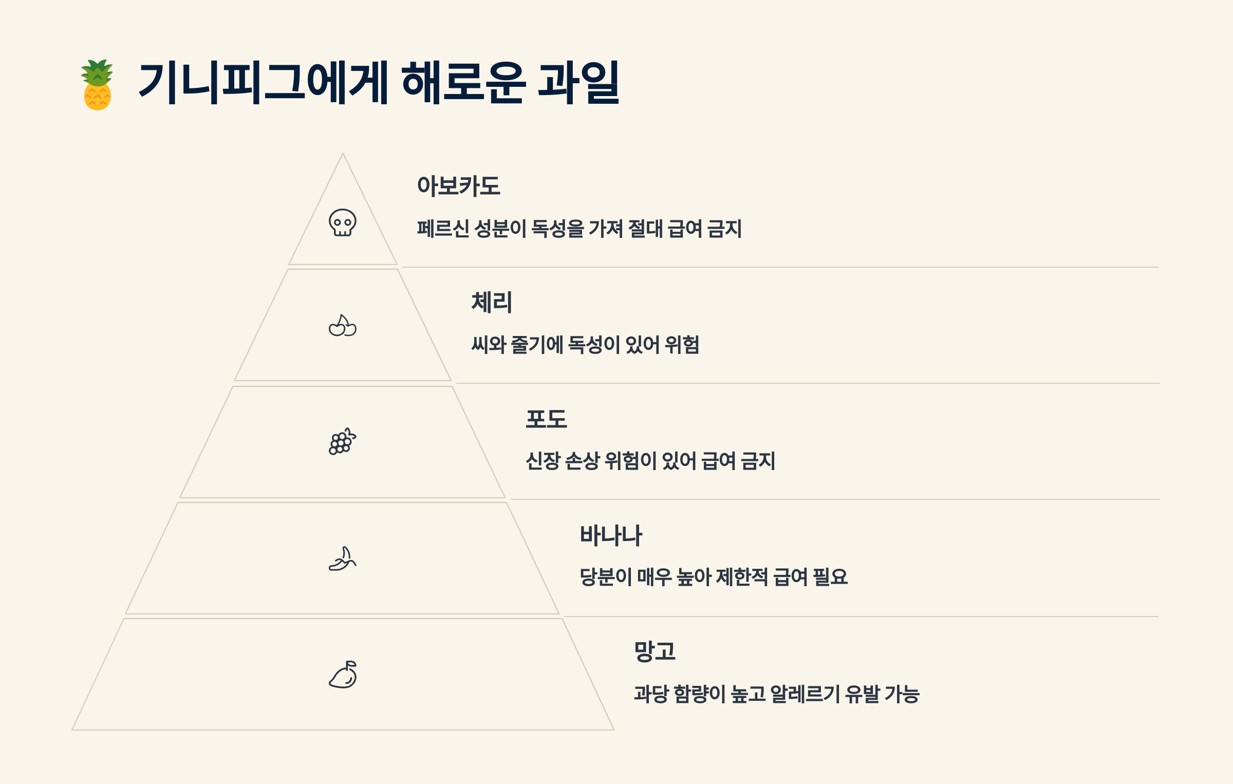 🚫 아무리 기니피그가 맛있게 먹는다 해도, 해로운 과일은 절대 급여하면 안 돼요. 보호자의 선택이 생명에 직결될 수 있다는 걸 항상 기억해야 해요!