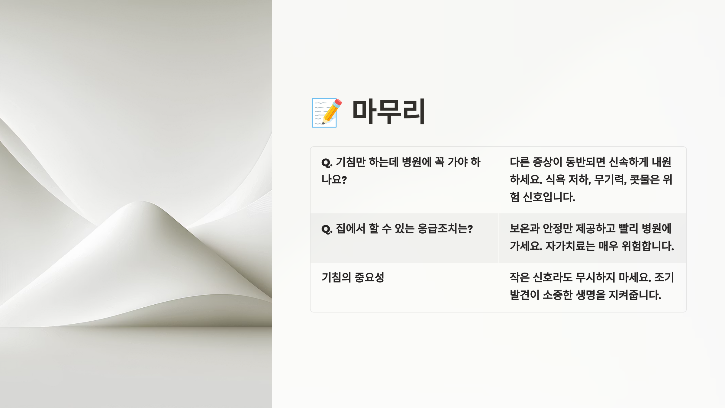 위험한 증상들을 미리 알아두고 빠른 대처를 하는 것이 생명을 구할 수 있어요! 🚨