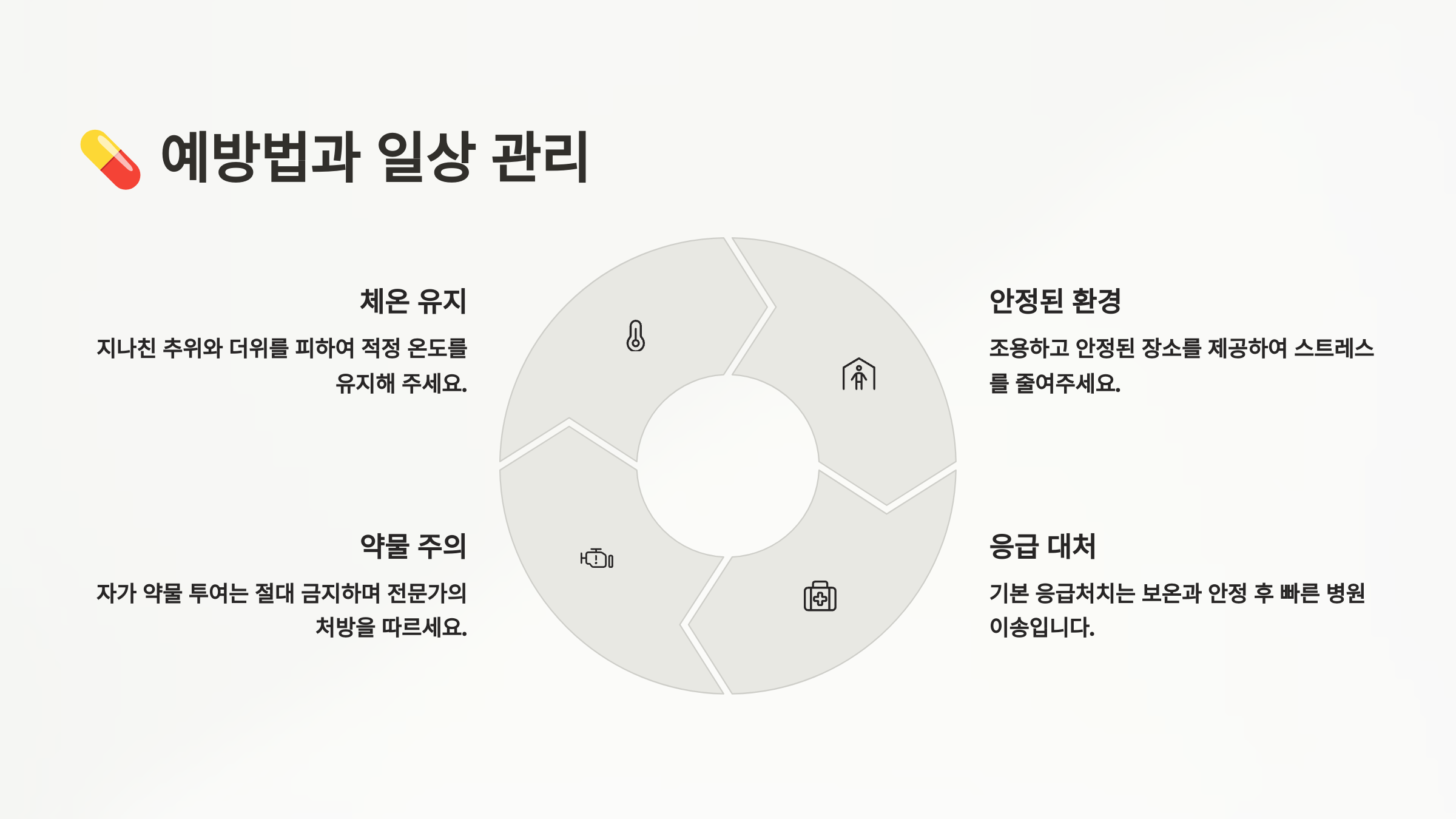 | 경련 | 주변 정리 | 보온 조치 | 전문의 상담 |