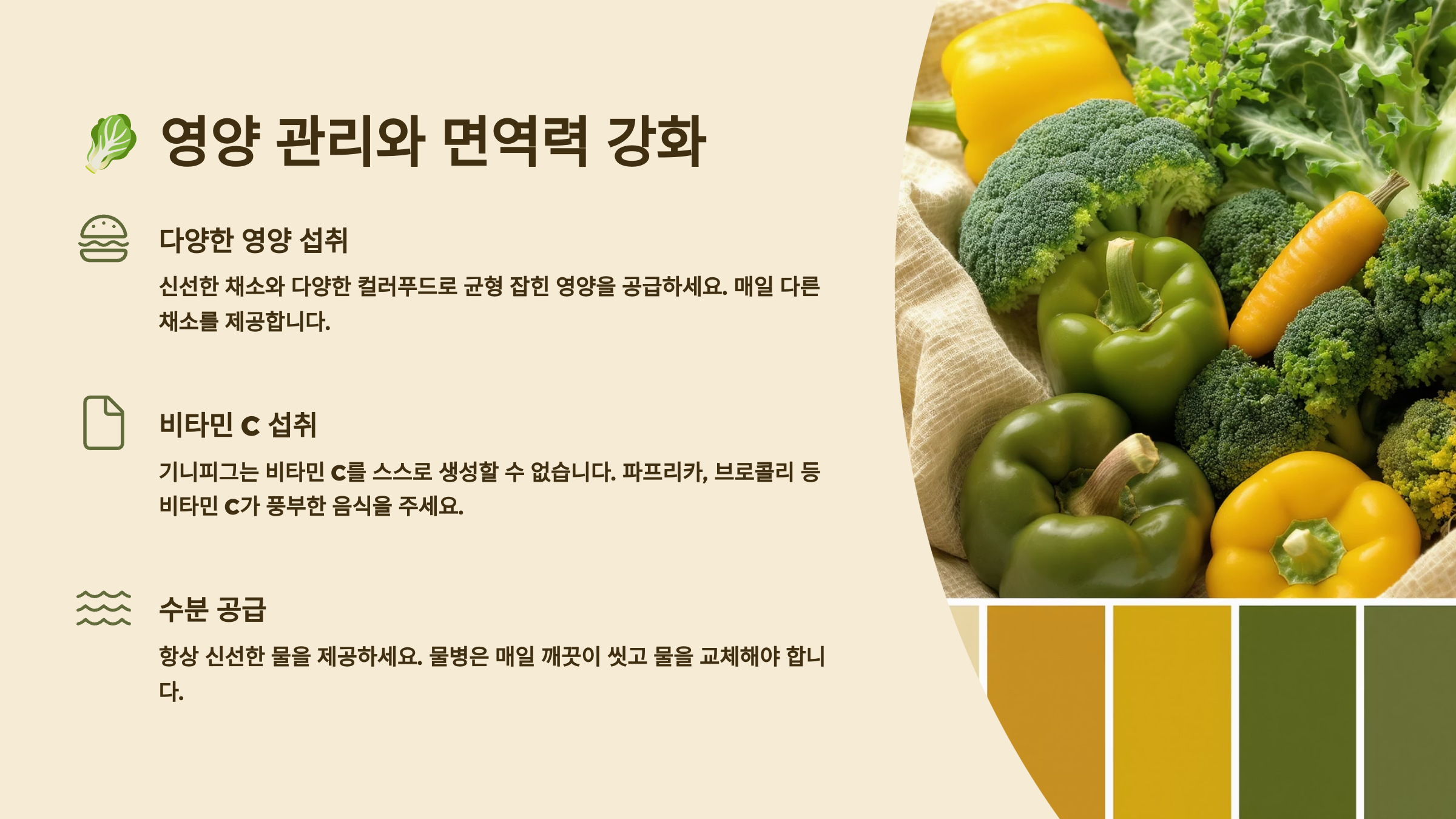 영양제를 별도로 급여하는 것보다는 자연 식품을 통해 영양소를 공급하는 것이 훨씬 안전하고 효과적이에요. 다만 수의사가 처방한 영양제나 비타민C 보충제는 지시에 따라 정확히 급여해주세요! 🥬