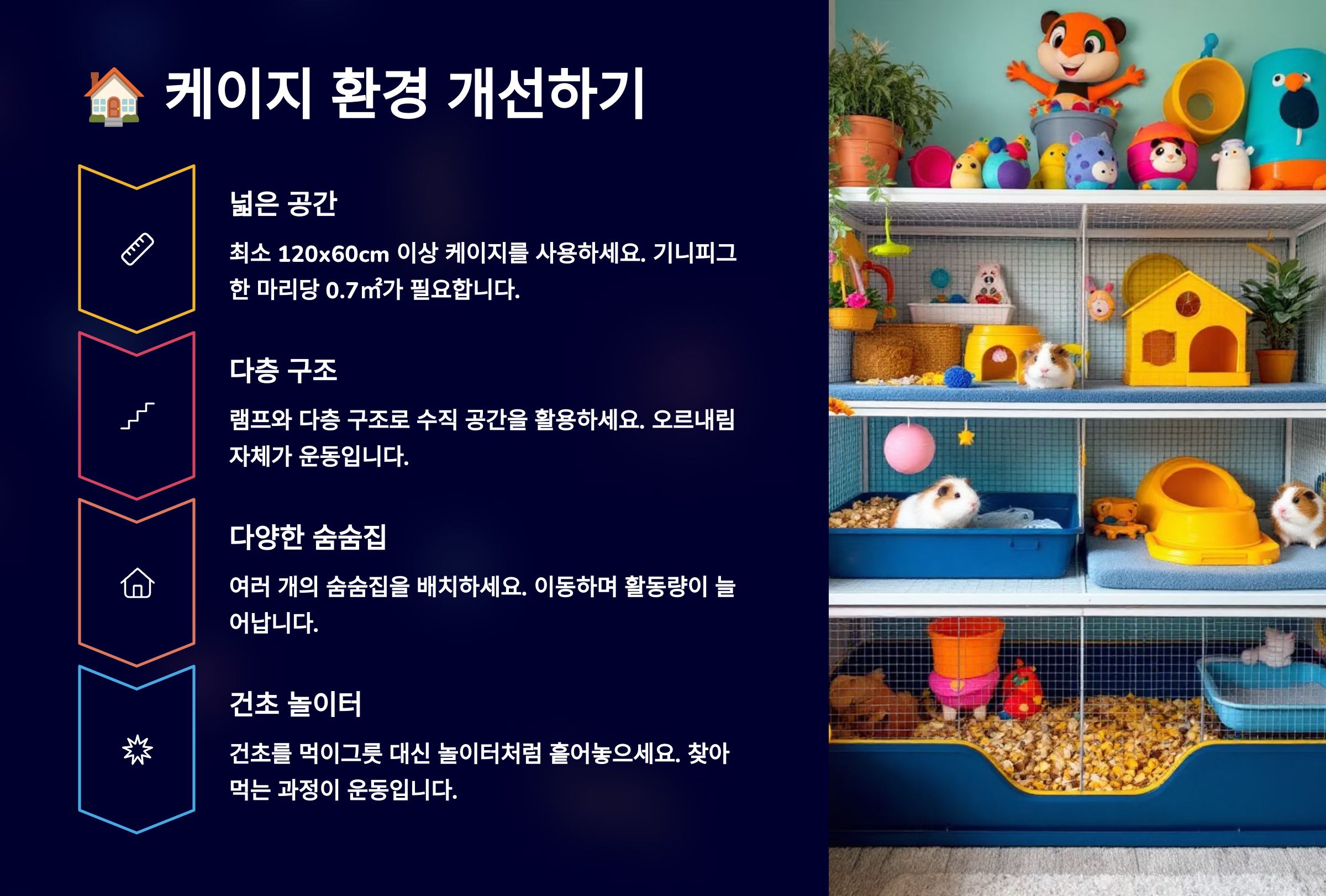 비만 예방과 관리에 있어 가장 기본이 되는 건 바로 기니피그의 생활 공간이에요. 너무 작고 단조로운 케이지는 활동량을 제한하고, 결국 운동 부족 → 지방 축적으로 이어지게 돼요.