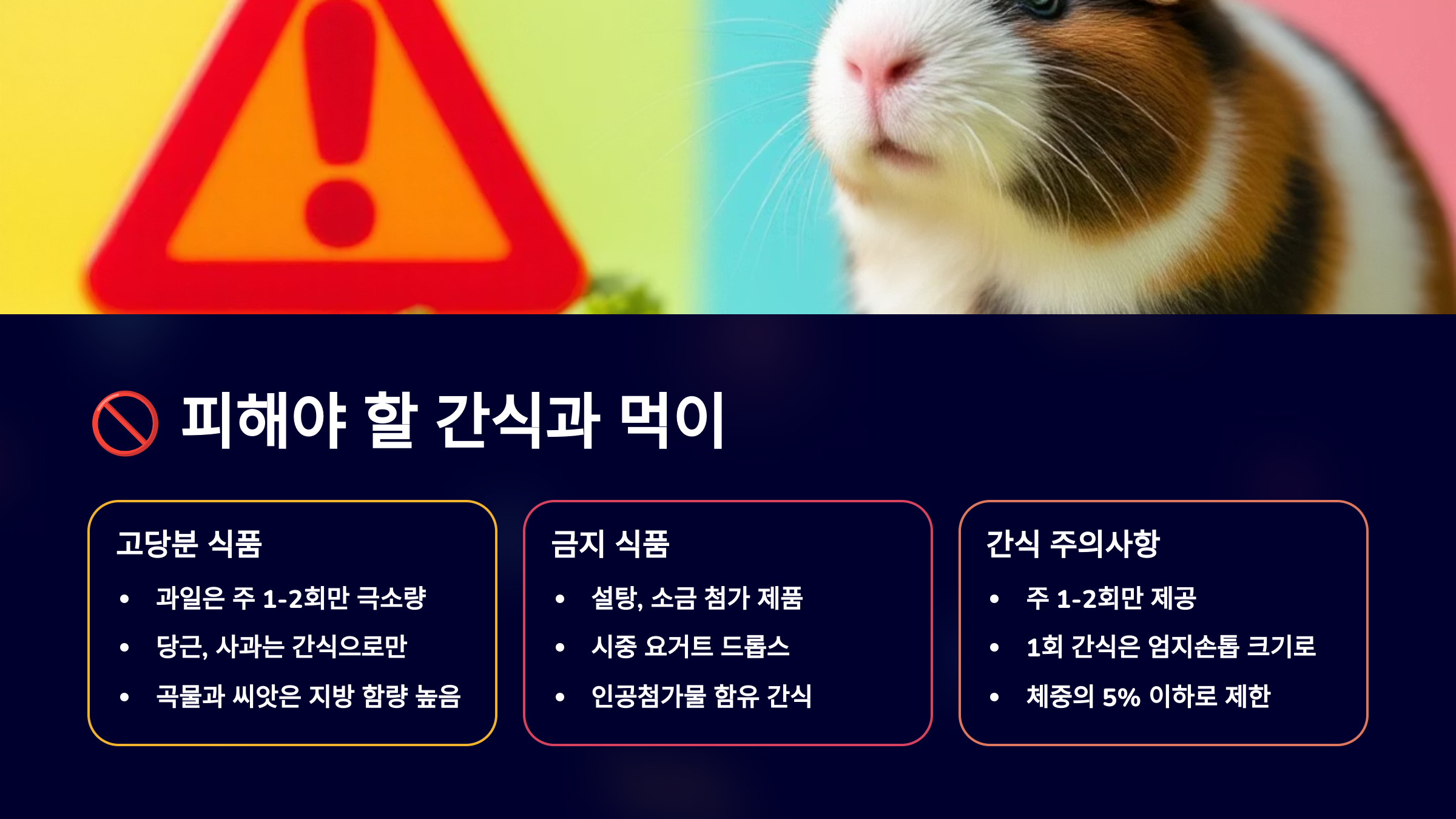 아래는 기니피그에게 피해야 할 주요 먹이들을 정리한 표예요. 다음은 🐾 일상 속 운동량 늘리는 방법을 안내해드릴게요!