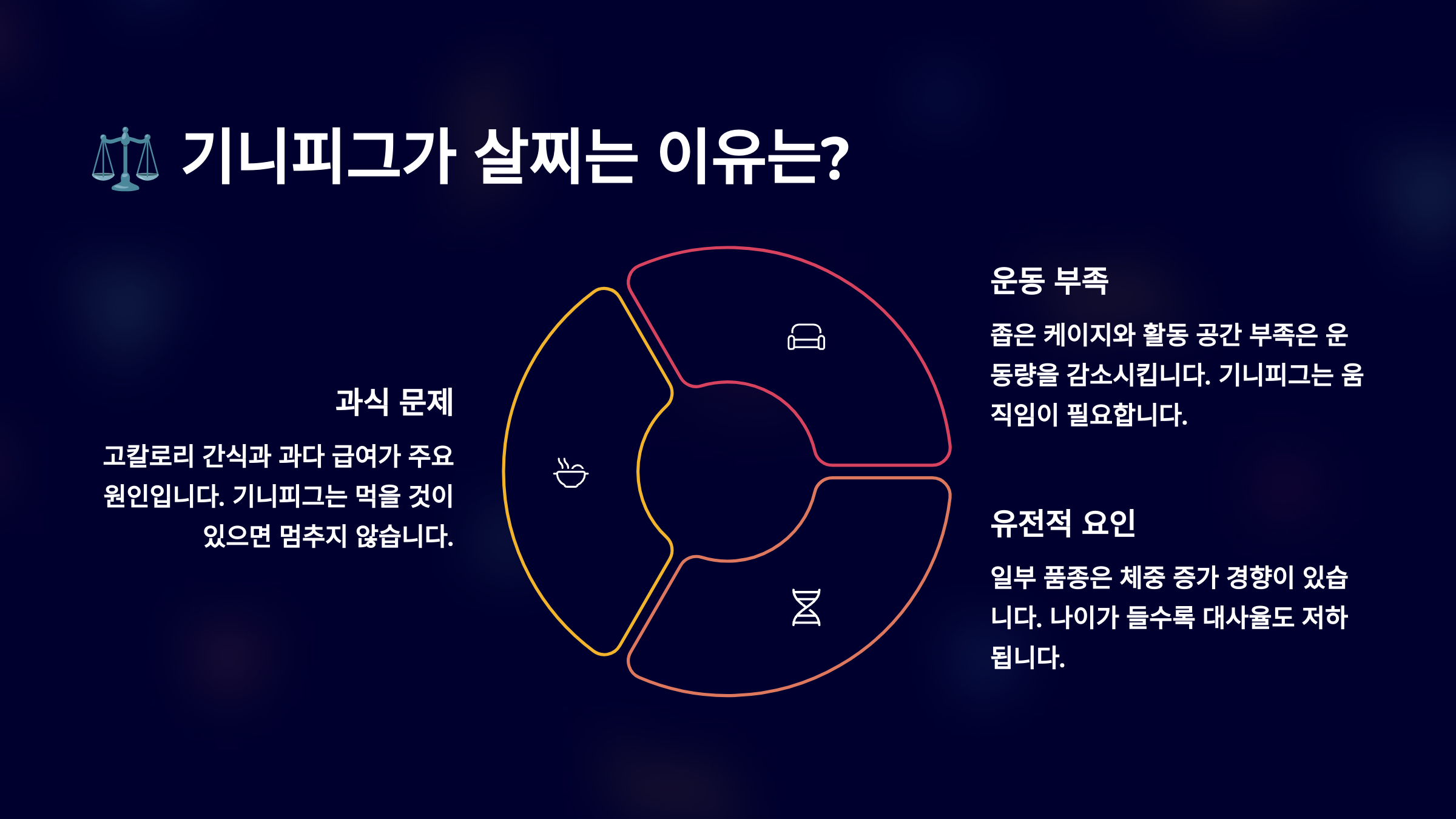 아래는 기니피그 비만을 유발하는 주요 요인들을 정리한 표예요. 다음 섹션에서는 🥬 기니피그를 위한 저칼로리 식단 구성을 안내해드릴게요!