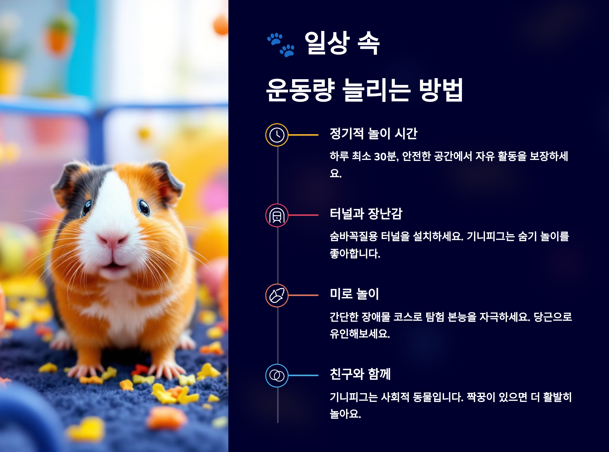 꼭 오늘부터! 식단 점검부터 운동 놀이까지 하나하나 루틴을 정리해보세요. 기니피그의 몸이 가벼워질수록 표정도 밝아지고, 움직임도 훨씬 활발해질 거예요. 🐹💪✨