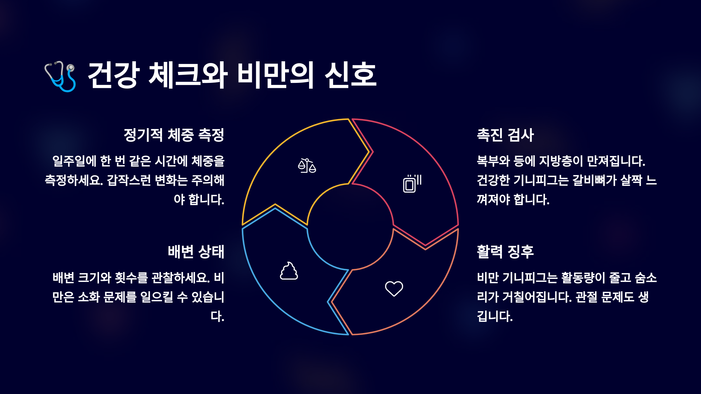 아래는 기니피그의 비만을 의심할 수 있는 주요 신호 체크리스트예요. 다음은 📅 꾸준한 관리 루틴 만들기를 안내해드릴게요!