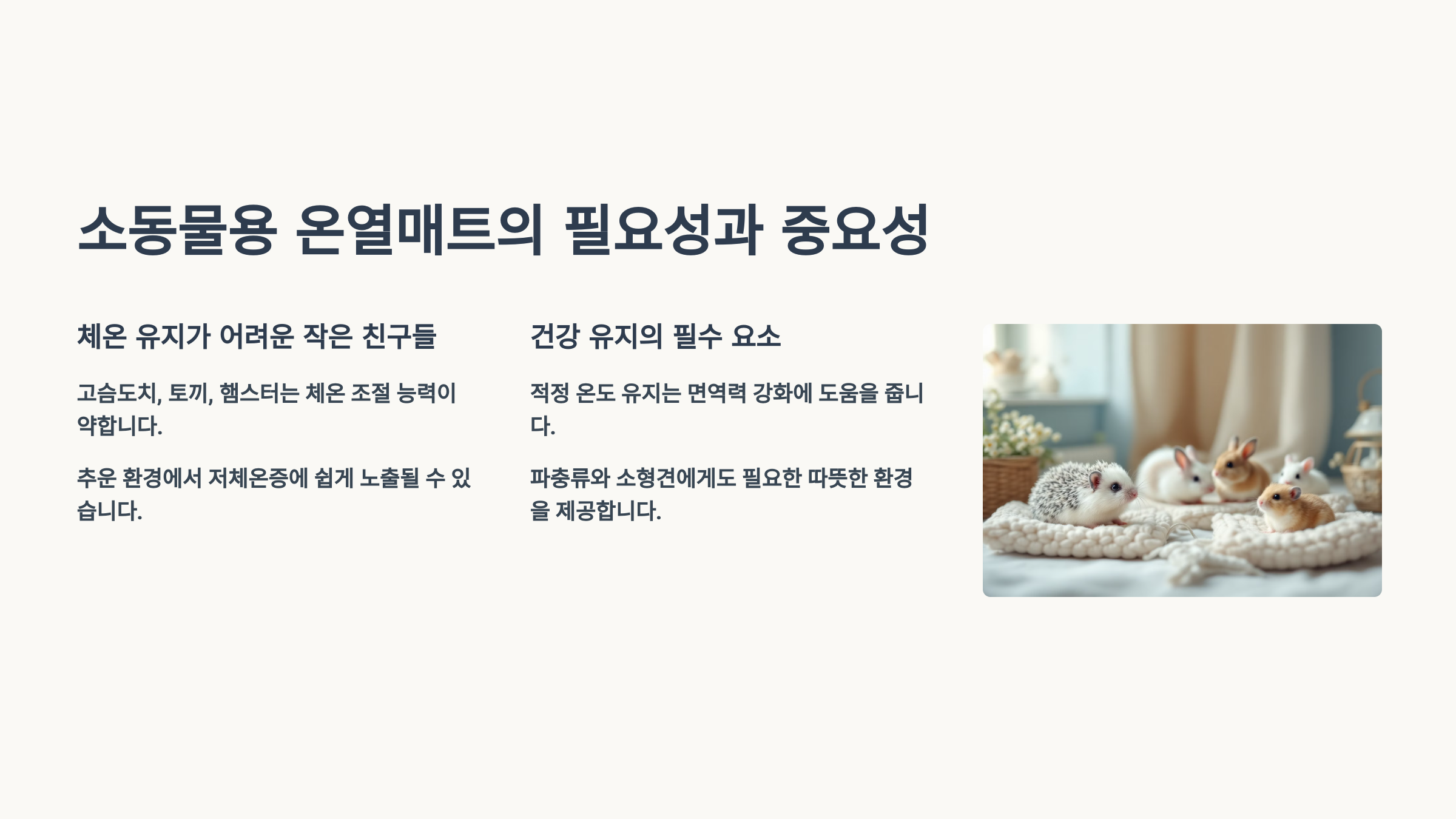 내가 생각했을 때 가장 중요한 건 소동물들의 야생 서식지 환경을 이해하는 거예요. 대부분의 소동물들은 원래 따뜻한 지역이나 지하에서 살았기 때문에 일정한 온도를 유지하는 환경에 익숙해요. 실내에서 키우는 환경에서는 계절 변화나 에어컨, 난방기 사용으로 인해 온도 변화가 심해서 스트레스를 받을 수 있어요. 온열매트는 이런 온도 변화로부터 우리 작은 친구들을 보호해주는 든든한 보호막 역할을 해줘요.