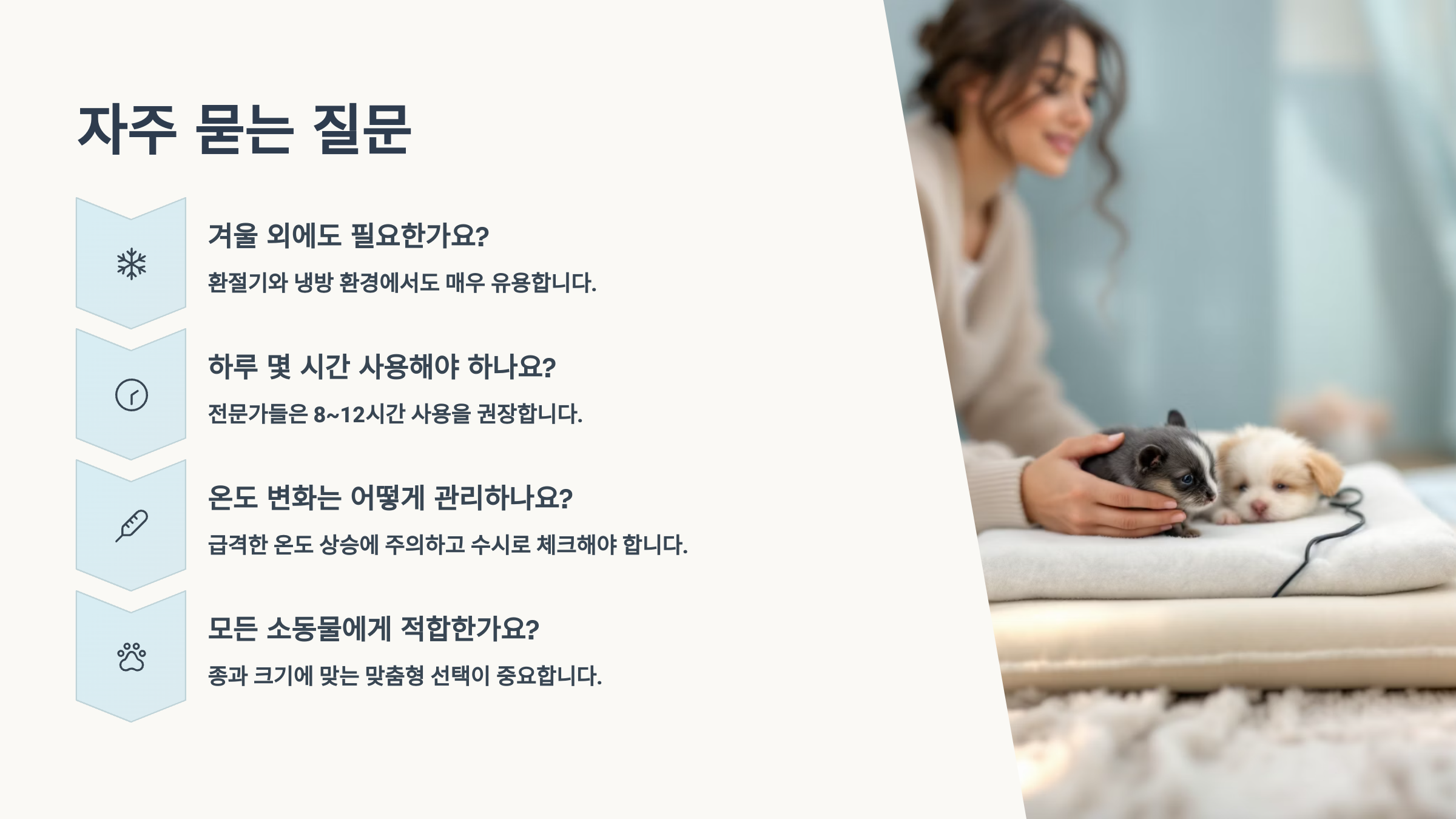가장 중요한 건 우리가 키우는 동물의 특성을 잘 이해하고 그에 맞는 제품을 선택하는 거예요. 안전 인증을 받은 제품을 선택하고, 적절한 크기와 온도 조절 기능이 있는 제품을 고르세요. 또한 정기적인 점검과 청소를 통해 안전하게 사용하는 것도 잊지 마세요.