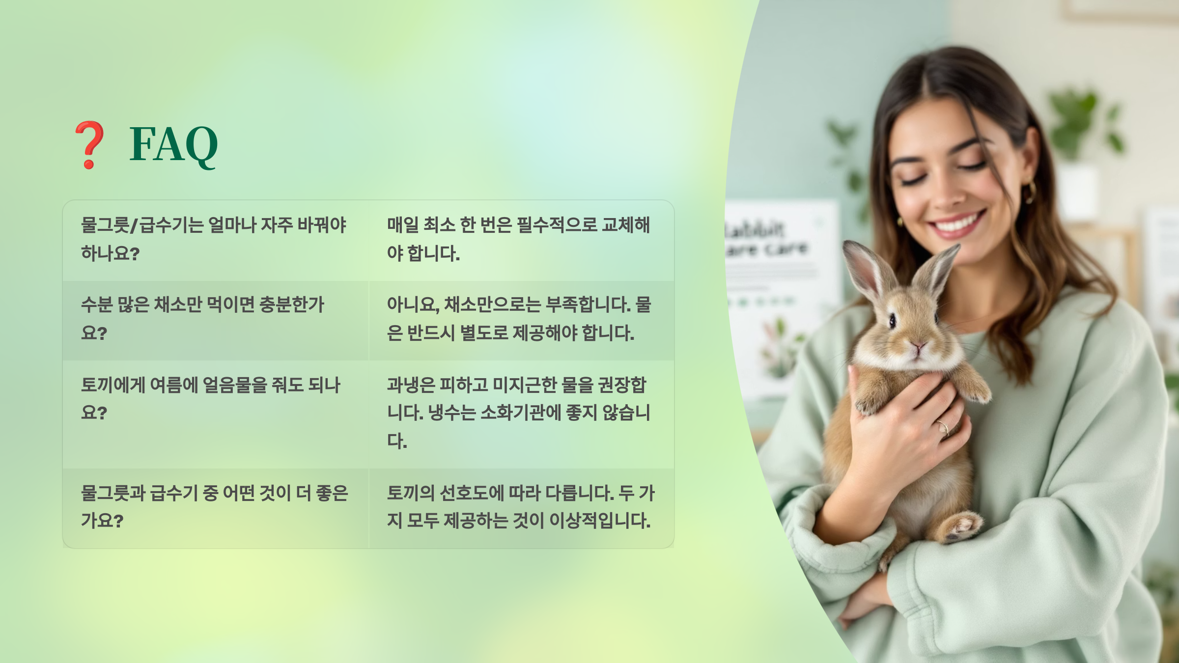A8. 물그릇에 생긴 이끼나 세균막은 토끼 전용 세제나 베이킹소다로 깨끗하게 닦아주세요. 뜨거운 물로 헹군 후 완전히 말려서 사용하고, 물은 매일 갈아주는 것이 중요해요.