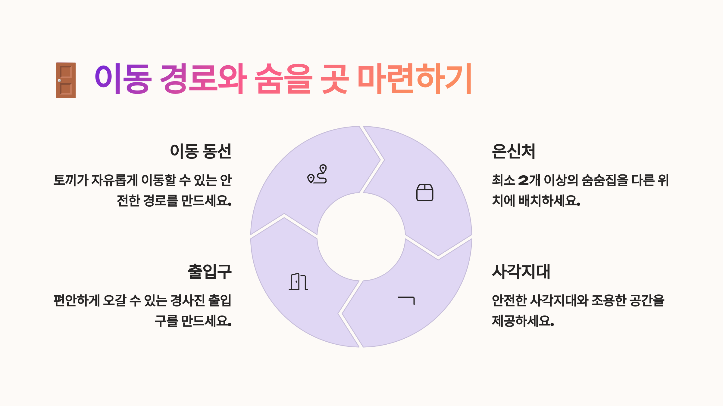 - 3. 은신처 연결 통로 – 터널을 연결해주면 토끼가 탐험하면서 스트레스도 해소돼요.