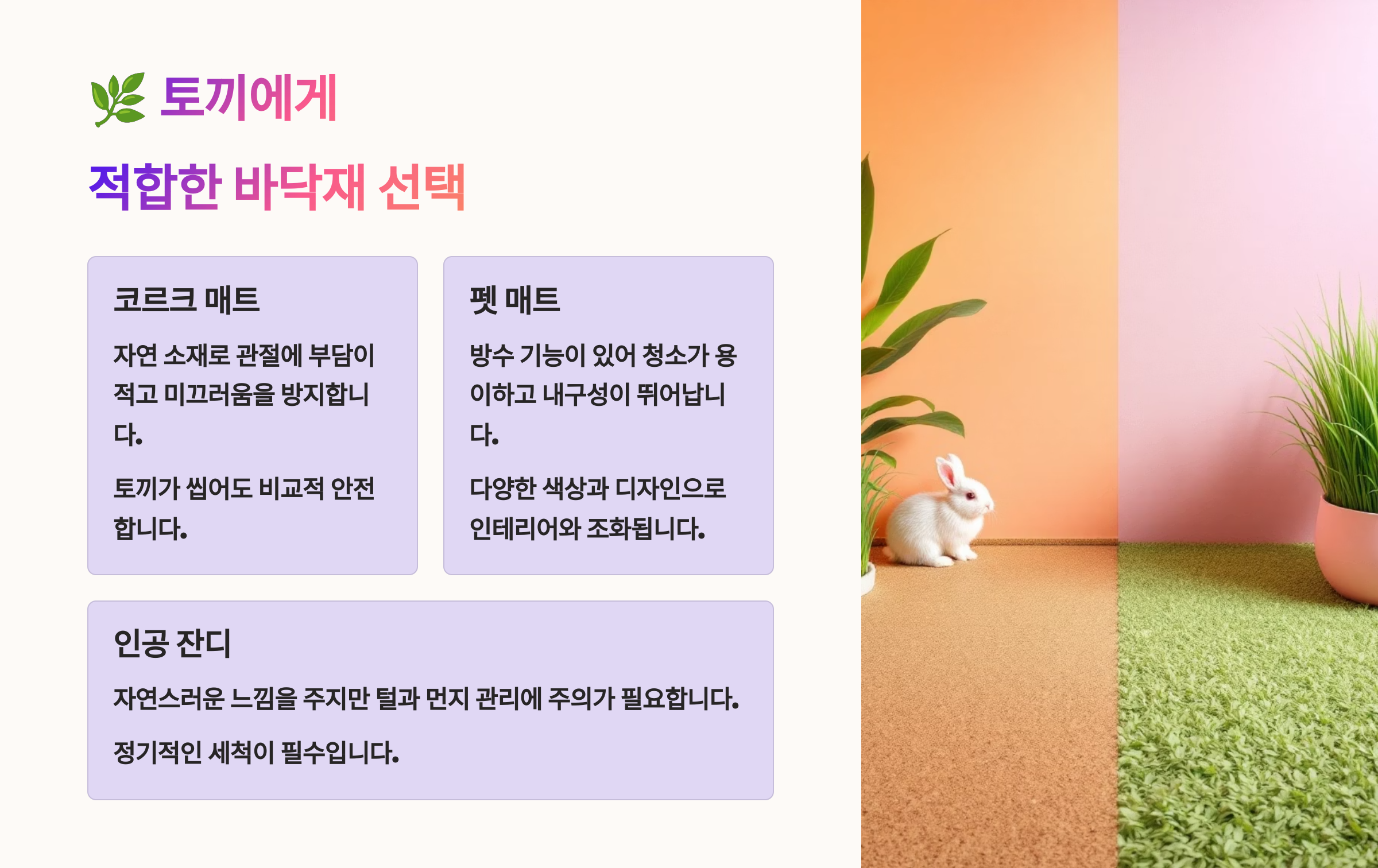 🌿 토끼 놀이공간을 만들 때 가장 신경 써야 할 부분 중 하나가 바로 '바닥재'예요. 잘못된 바닥은 미끄럼 사고를 유발하거나, 발바닥 질병(소염성 발바닥염)으로 이어질 수 있어요. 토끼의 관절과 발바닥을 보호할 수 있는 바닥을 꼭 선택해야 해요 🐾