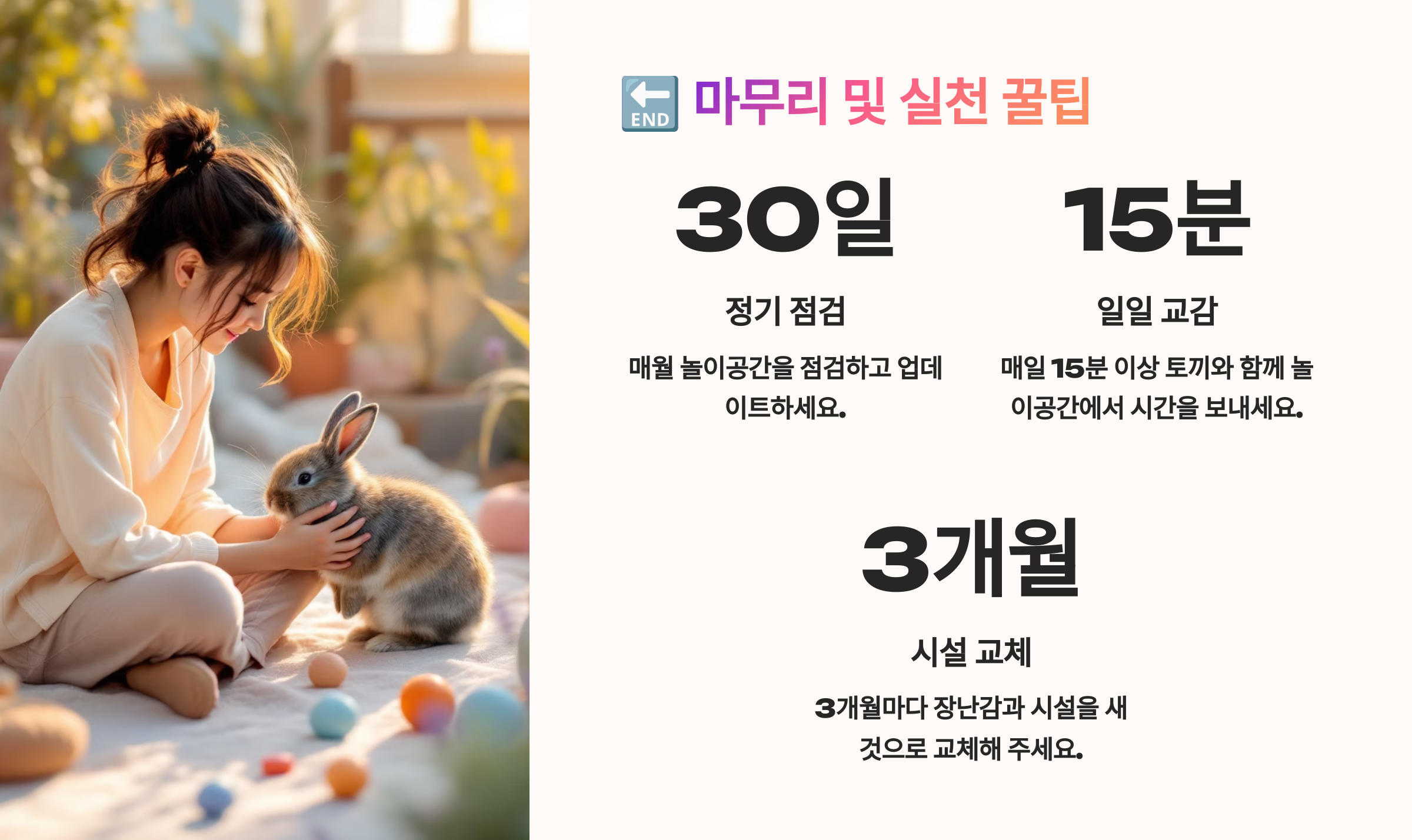 작은 변화 하나로 토끼의 삶은 놀랍게 달라질 수 있어요. 오늘 소개한 방법들을 참고해서, 우리 아이만의 특별한 놀이터를 만들어주세요. 우리 함께 토끼의 ‘행복한 점프’를 매일 볼 수 있기를 바라요 🏡🐇✨