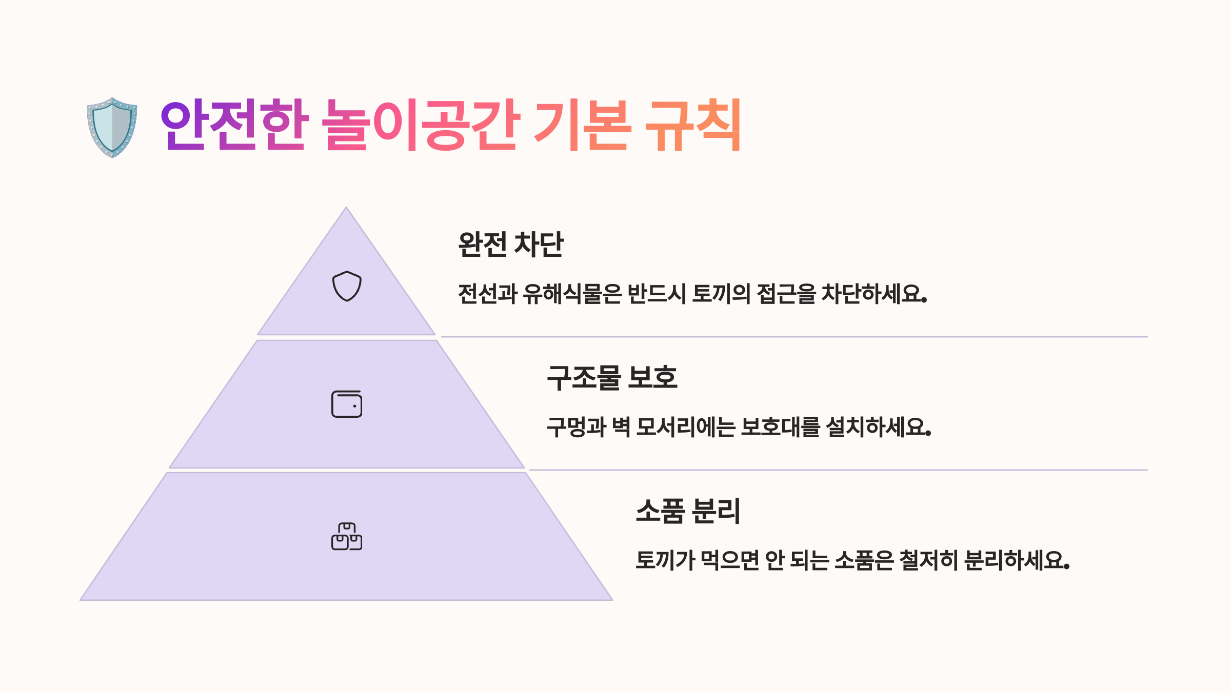 다음은 토끼 놀이공간을 만들 때 꼭 지켜야 할 기본 안전 규칙이에요: