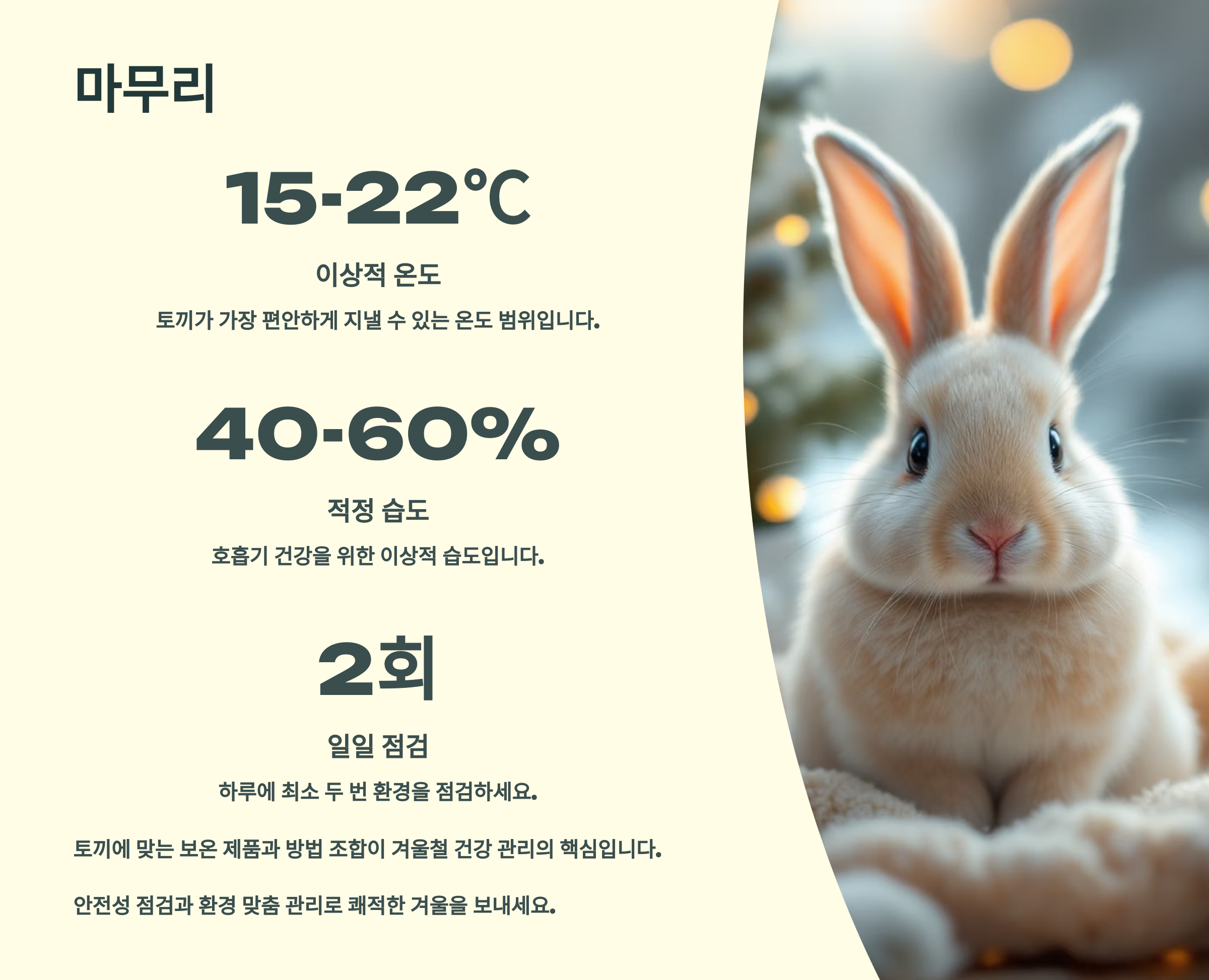 겨울철 토끼에게 가장 위험한 것은 급격한 온도 변화예요. 하루 중 온도 차이가 5도 이상 나면 토끼의 면역체계가 약화되어 호흡기 질환이나 소화기 장애가 발생할 수 있어요. 또한 습도도 중요한 요소인데, 너무 건조하면 호흡기 점막이 건조해져서 세균 감염이 쉬워지고, 너무 습하면 곰팡이나 세균 번식이 활발해져요. 적정 습도는 50-60% 사이를 유지하는 것이 좋아요. 토끼 사육 공간의 온도는 일정하게 유지되어야 하며, 바닥 온도가 특히 중요해요.