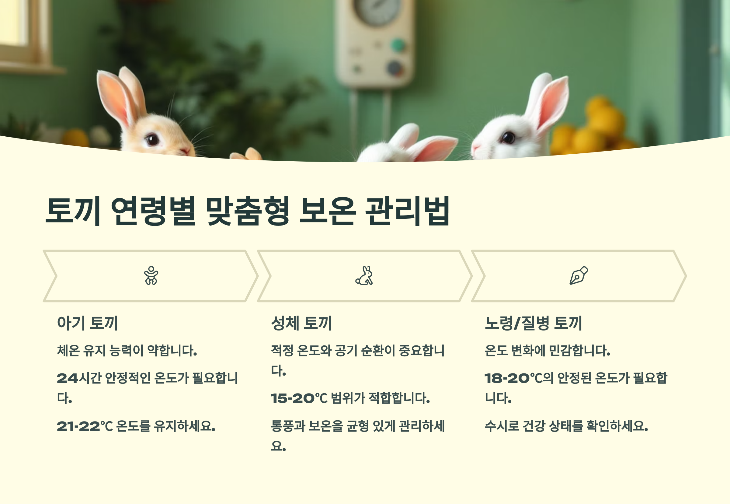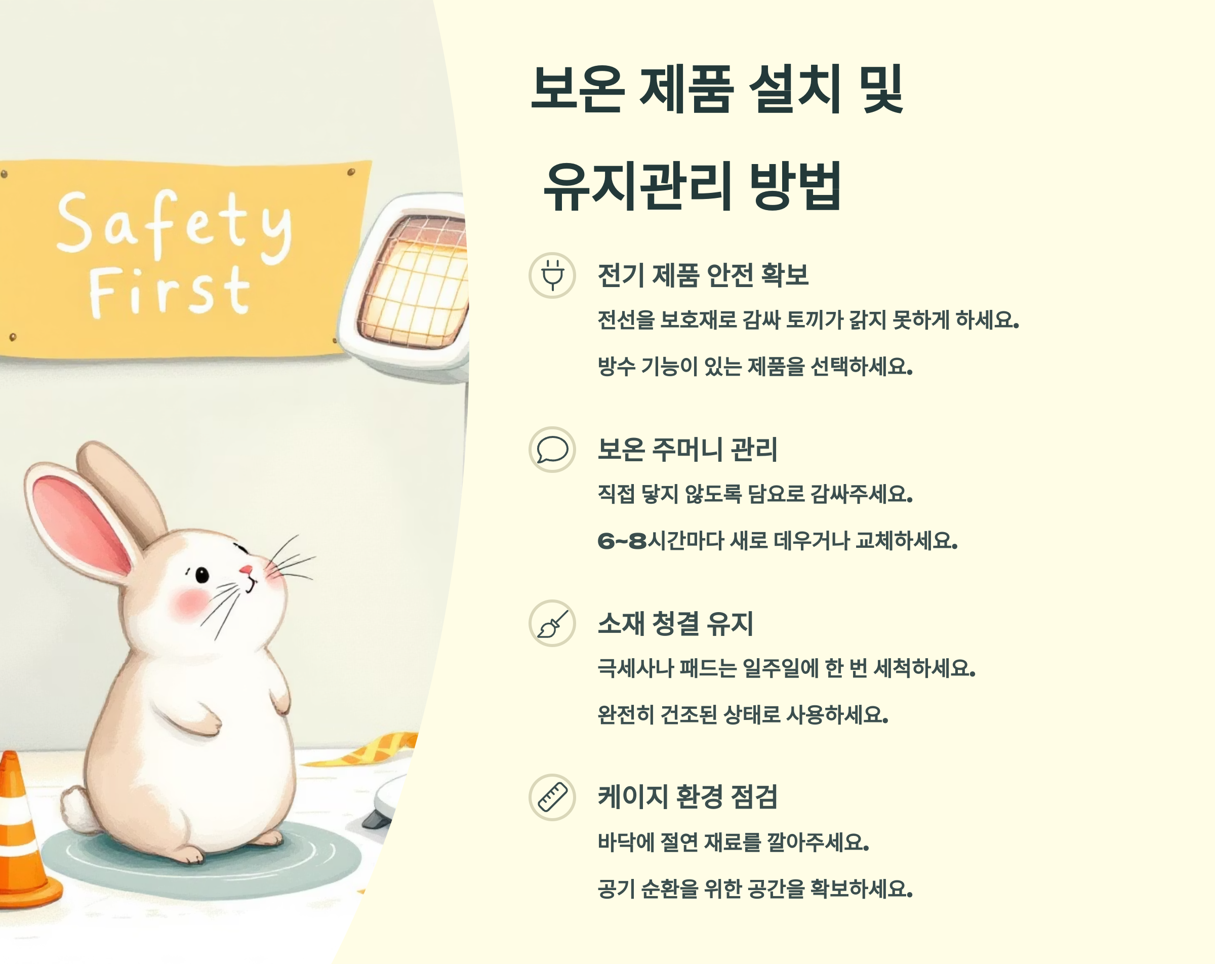 | 어린토끼(3-6개월) | 25-28°C | 55-65% | 전선 보호 필수 | 바닥 난방 패드 |