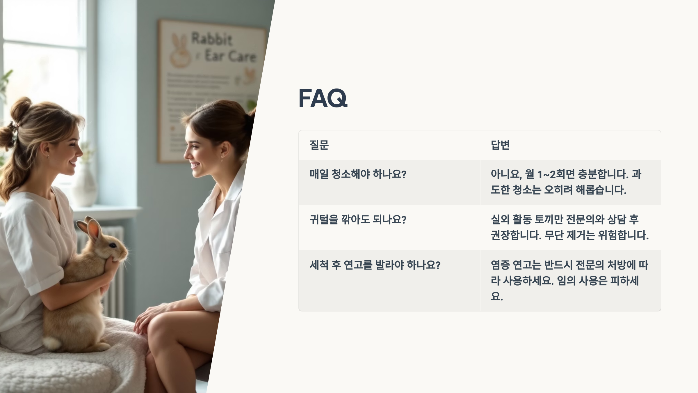 네 번째는 전문적인 귀청소 교육을 받고 싶을 때예요. 처음 토끼를 키우는 보호자나, 이전에 실수를 했던 경험이 있는 보호자라면 수의사에게 직접 올바른 귀청소 방법을 배우는 것이 좋아요. 이론으로만 알고 있는 것과 실제로 해보는 것은 완전히 다르거든요. 전문의에게 실습을 통해 배우면 훨씬 안전하고 효과적으로 할 수 있어요.