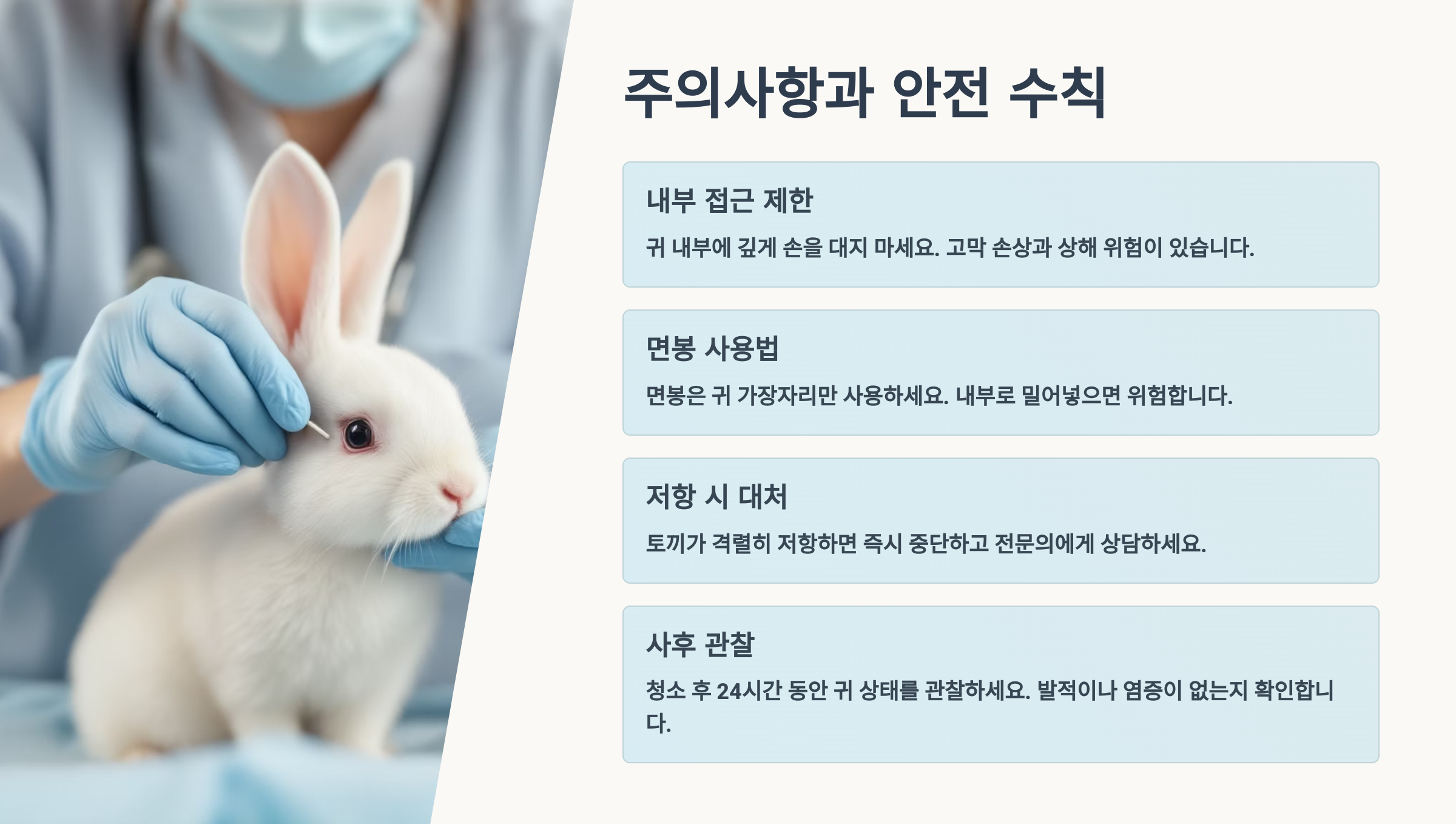토끼 귀청소에서 가장 중요한 것은 안전이에요. 절대로 무리한 힘을 가하거나 깊숙이 들어가려고 하면 안 됩니다. 토끼의 고막은 매우 얇고 섬세해서 작은 충격에도 손상될 수 있어요. 귀청소 도구가 귀 안쪽으로 2cm 이상 들어가지 않도록 주의하고, 항상 보이는 부분만 청소한다는 원칙을 지켜야 해요. 만약 귀지가 너무 깊숙한 곳에 있다면 집에서 무리하게 제거하려 하지 말고 수의사에게 맡기세요.