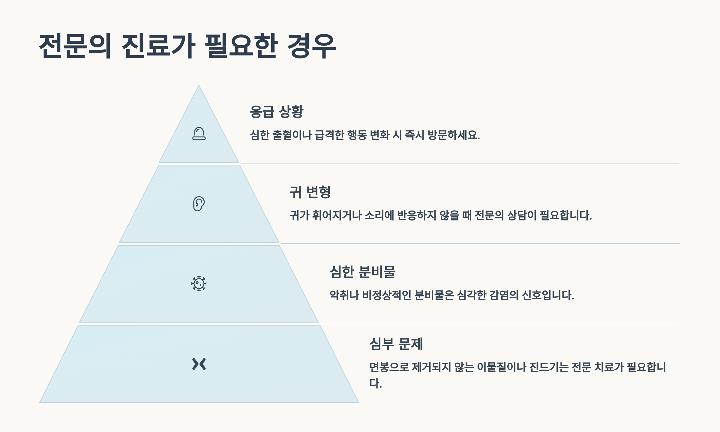 | 귀에 상처가 있을 때 | 감염 위험 | 수의사 진료 |