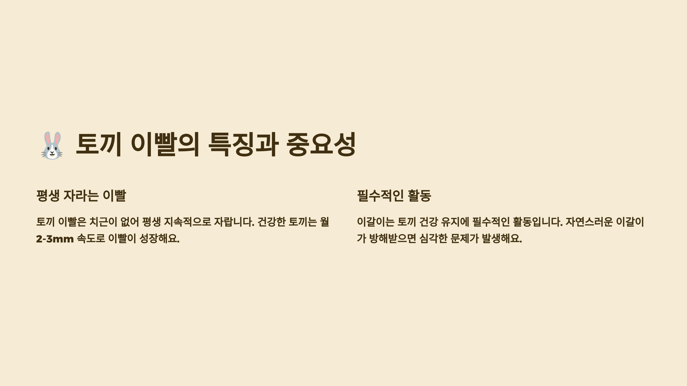 토끼의 이빨 건강은 토끼가 행복하고 건강한 삶을 살아가는 데 가장 중요한 요소 중 하나예요. 토끼는 평생에 걸쳐 이빨이 계속 자라는 특별한 동물이기 때문에 이빨 관리가 제대로 이루어지지 않으면 심각한 건강 문제로 이어질 수 있어요. 많은 토끼 보호자들이 이빨 관리의 중요성을 알지 못해 안타까운 상황이 발생하는 경우가 많답니다. 정기적인 점검과 올바른 관리 방법을 알고 있다면 우리 토끼가 평생 건강한 이빨을 유지할 수 있어요.