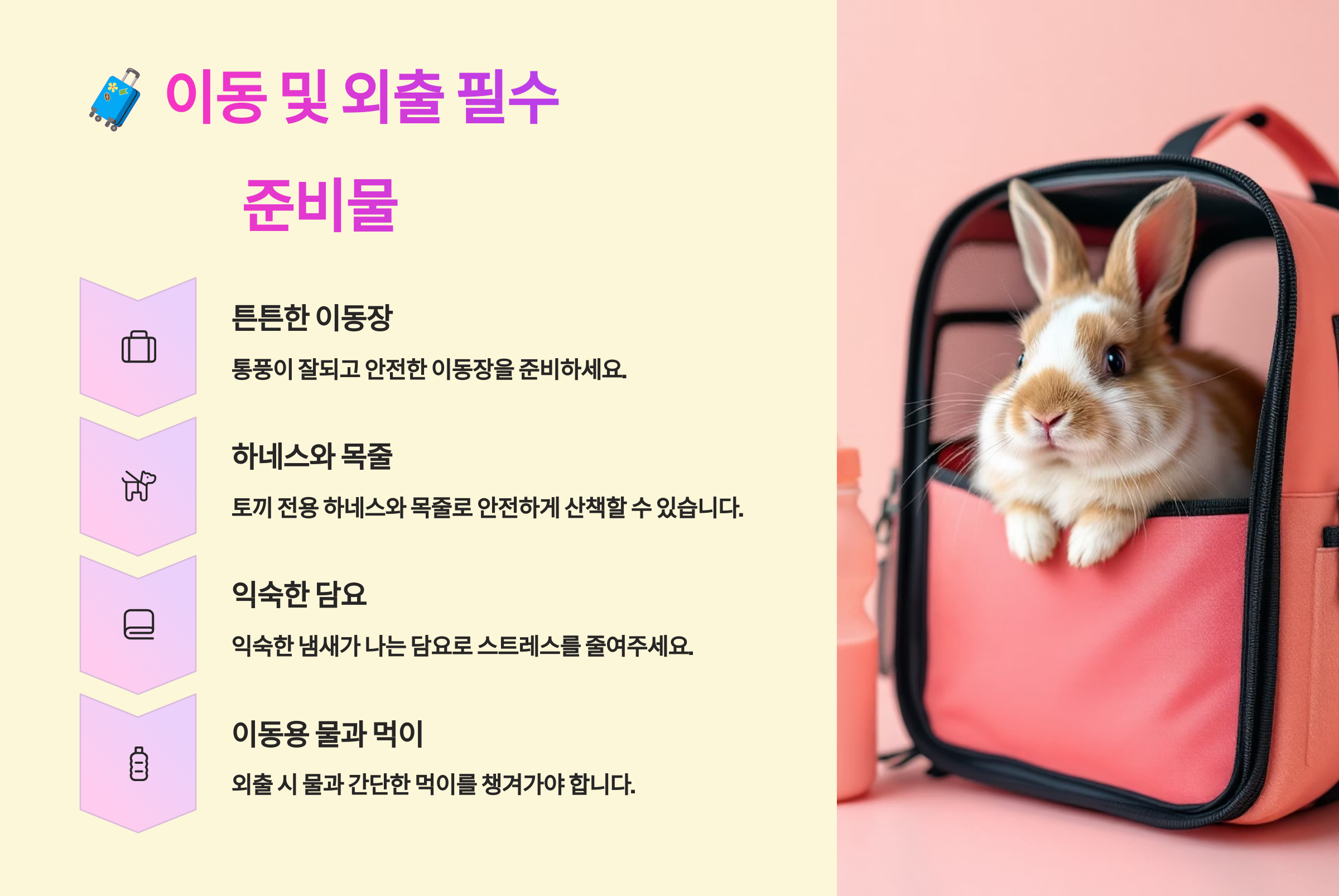 다음은 토끼 외출 시 꼭 챙겨야 할 이동 및 외부 활동 준비물을 소개할게요! 🧳🐰