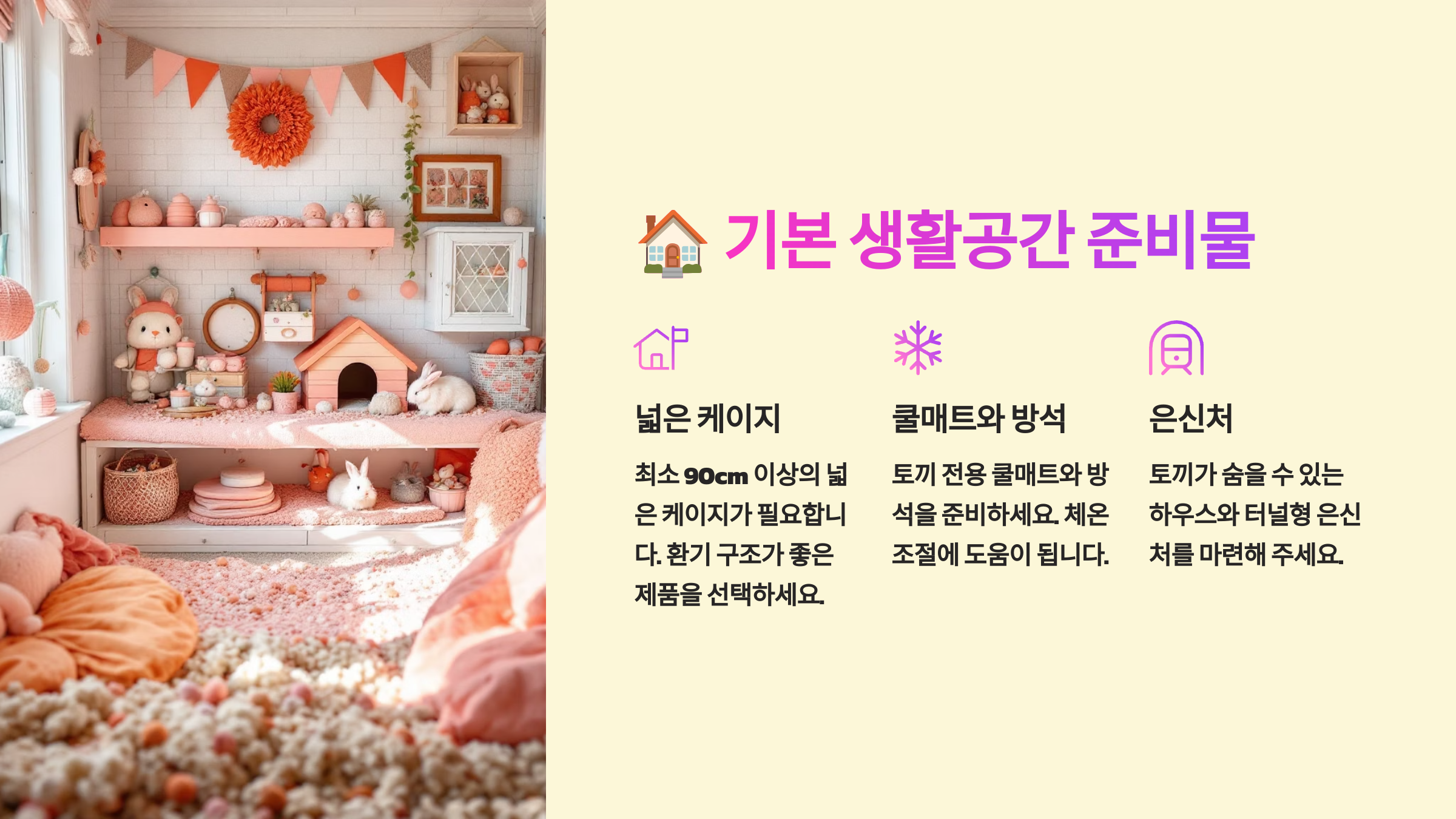 다음은 토끼의 기본 생활공간을 위한 필수 준비물을 안내해드릴게요! 🏠🐰