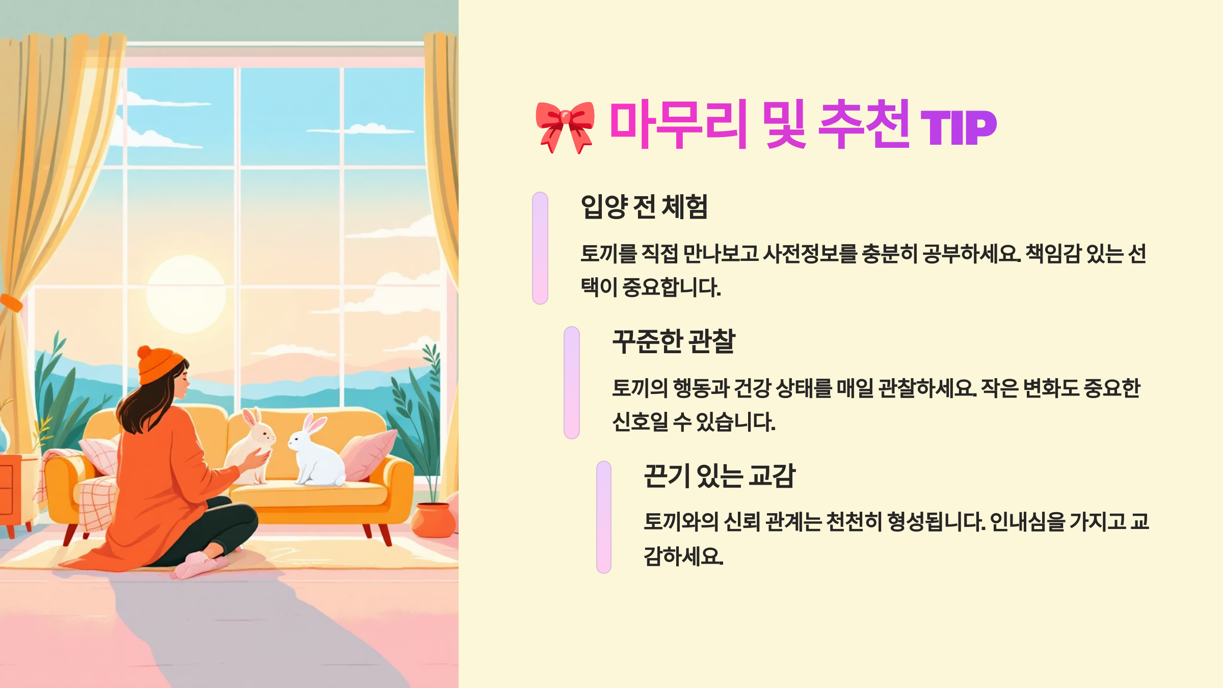 오늘 소개한 준비물 리스트는 토끼의 안전, 건강, 그리고 정서적 안정을 위한 필수 요소들이에요. 처음이라 낯설 수 있지만, 하나씩 준비하고 나면 훨씬 자신감 있게 아이를 맞이할 수 있을 거예요.
