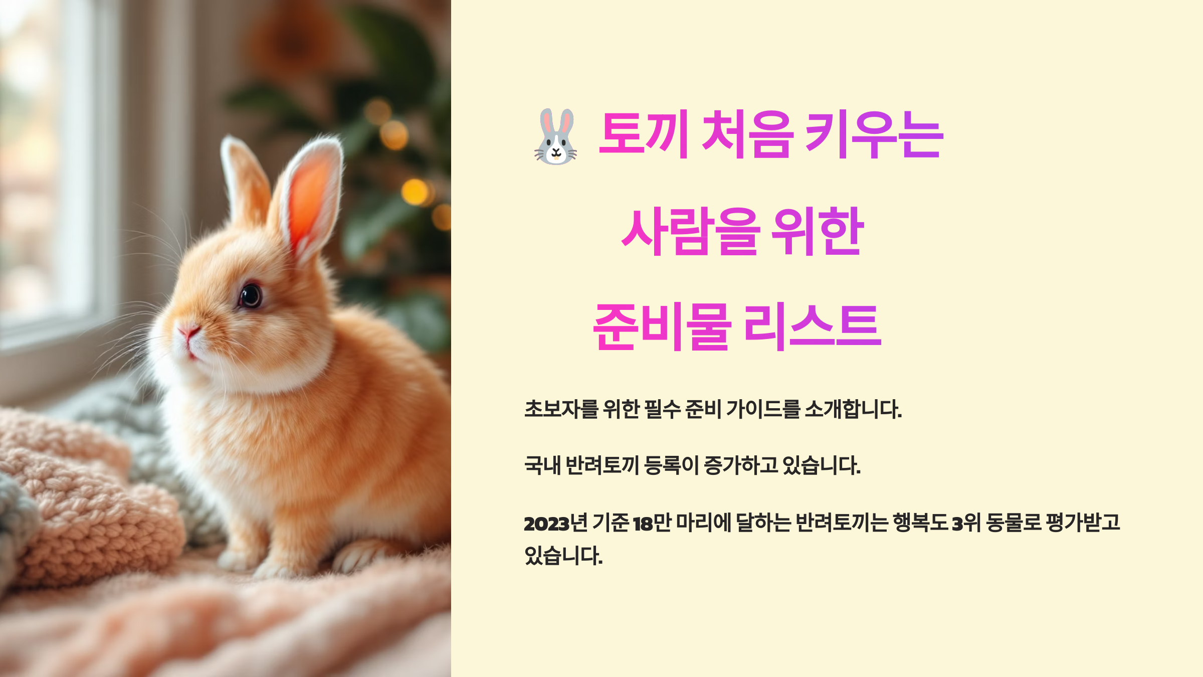 귀엽고 사랑스러운 외모 덕분에 많은 사람들이 토끼를 반려동물로 들이기 시작했어요. 하지만 토끼는 조용하고 섬세한 반려동물이라 처음 키우는 사람에게는 사전 준비가 정말 중요해요! 🐇💡