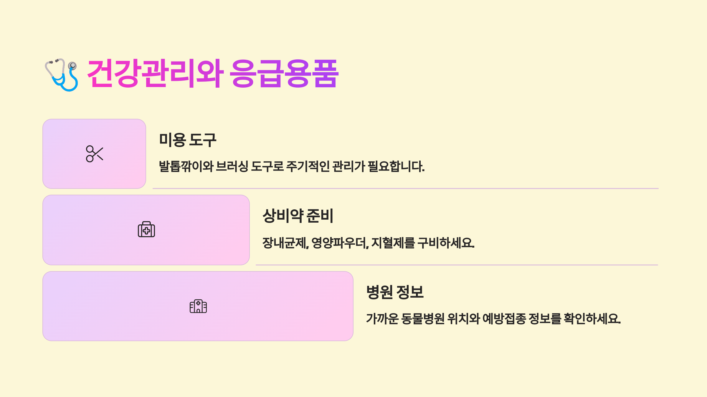 아래는 초보 보호자가 준비해두면 좋은 건강관리·응급 키트 리스트예요. 가정용 응급 키트를 하나 만들어두면 정말 든든해요! ✅
