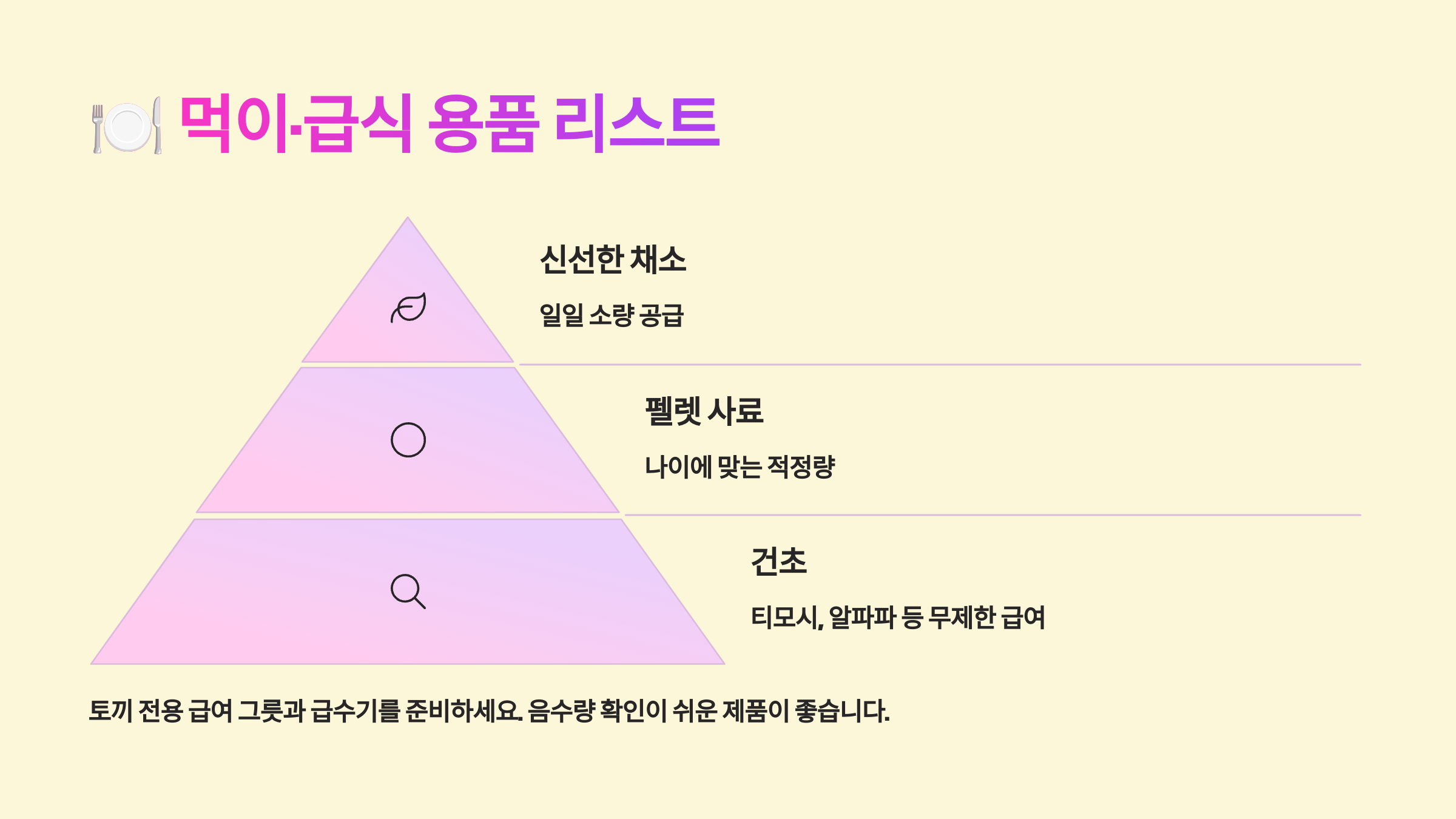 아래는 초보자가 준비해야 할 먹이 및 급식 용품 리스트예요. 준비 전 꼭 체크해보세요! ✅