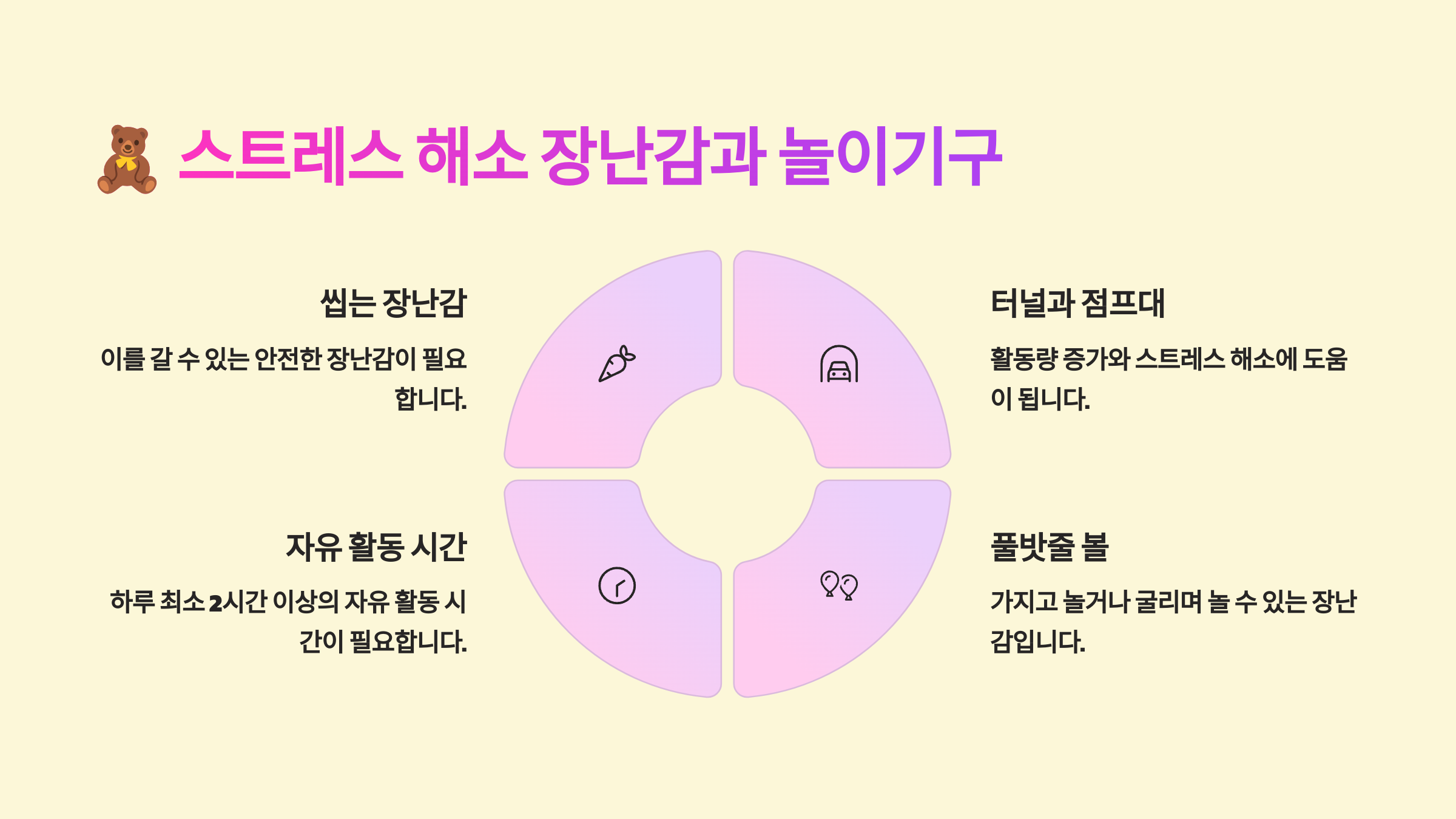 다음은 스트레스 해소와 지루함 방지를 위한 장난감과 놀이기구 섹션으로 넘어갈게요! 🧸🐰