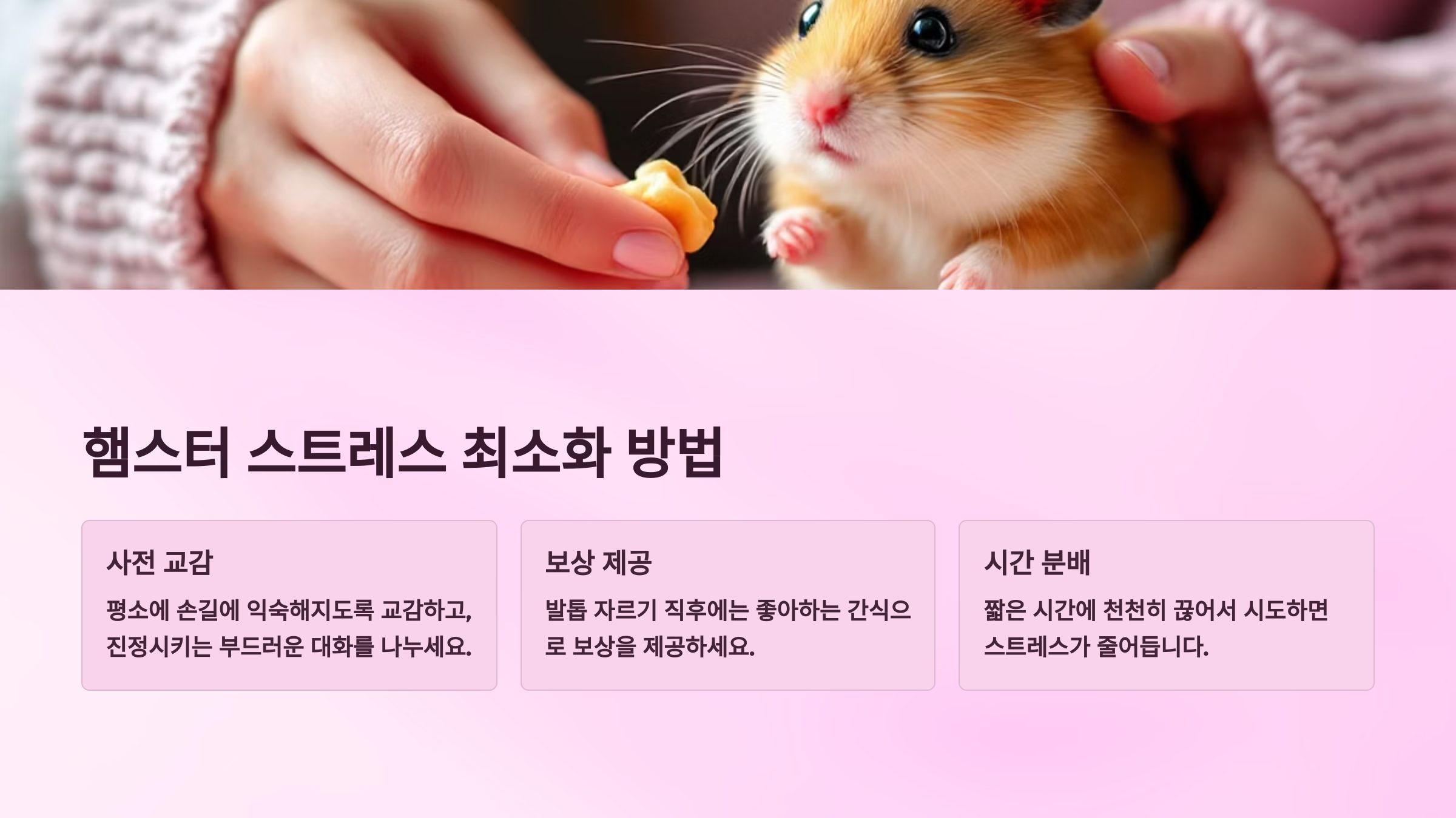 햄스터의 스트레스를 줄이면 발톱 관리가 훨씬 쉬워져요. 인내심을 가지고 천천히 접근해보세요! 😌