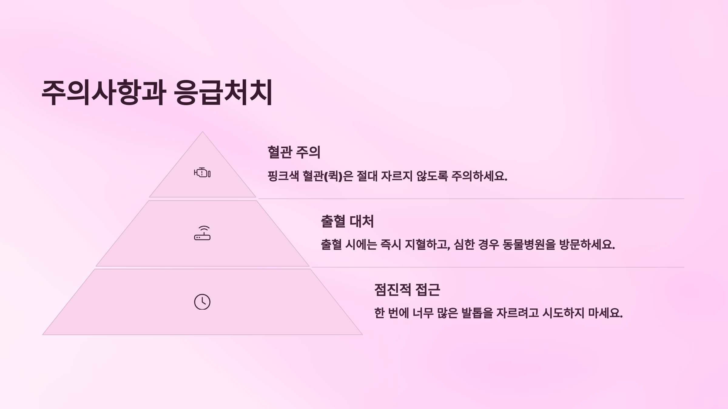 | 발톱 찢어짐 | 소독, 지혈 | 즉시 수의사 진료 |