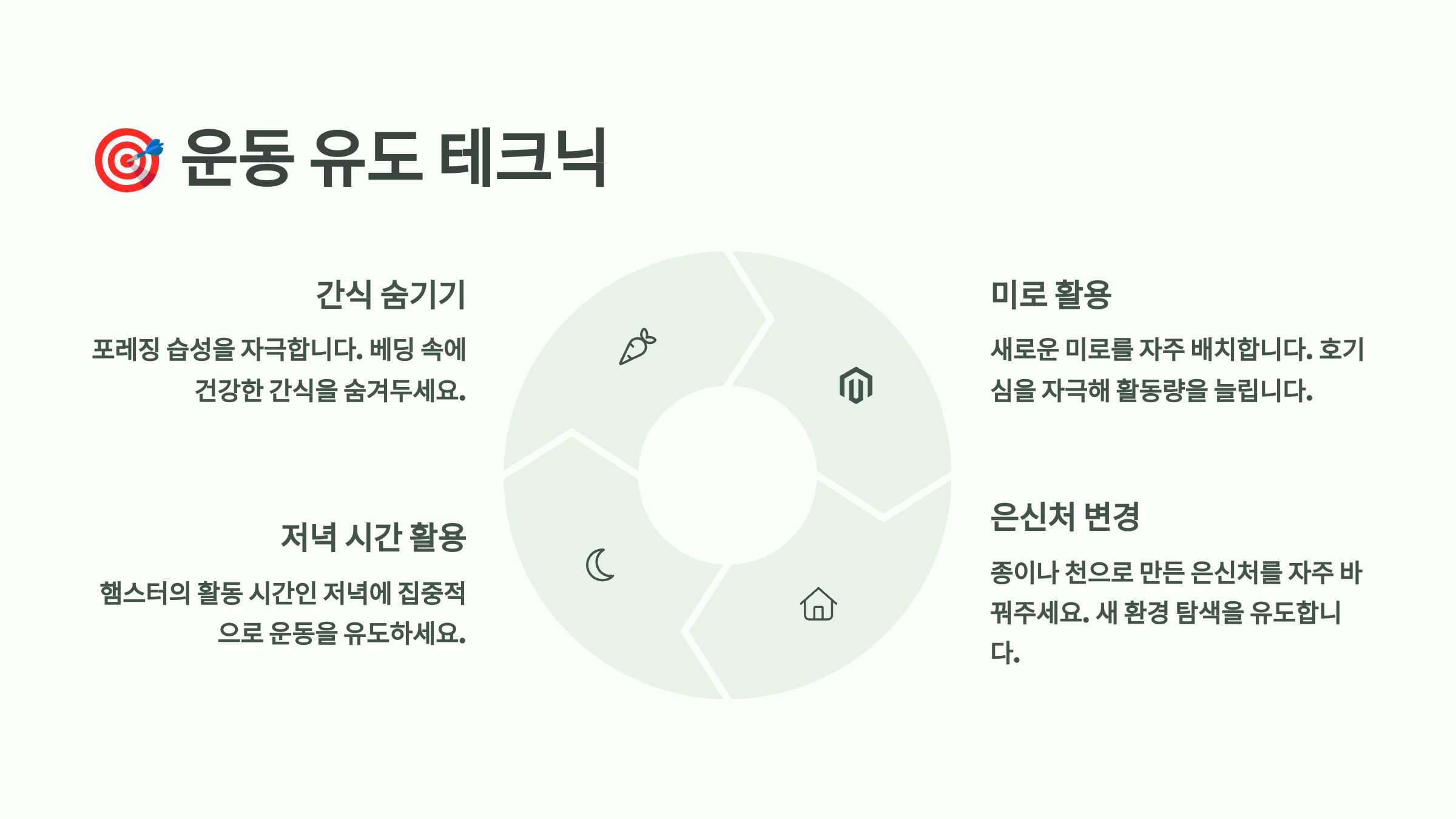 운동 유도 방법 중에서 먹이를 활용한 방법이 가장 효과적이고 지속적이에요. 햄스터의 자연스러운 본능을 활용하기 때문에 스트레스 없이 운동량을 늘릴 수 있습니다. 여러 방법을 조합해서 사용하면 더욱 좋은 결과를 얻을 수 있어요. 🎯