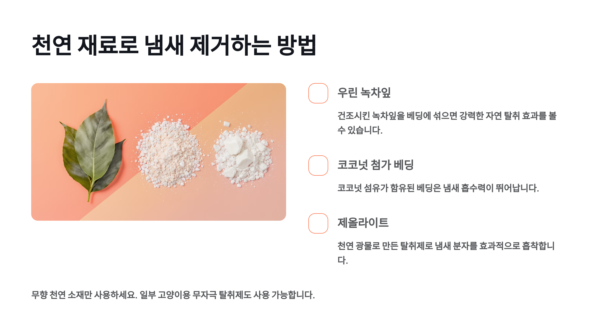 | 베이킹소다 + 물 | 2큰술 : 500ml | 스프레이로 분사 | 즉각적 냄새 제거 |