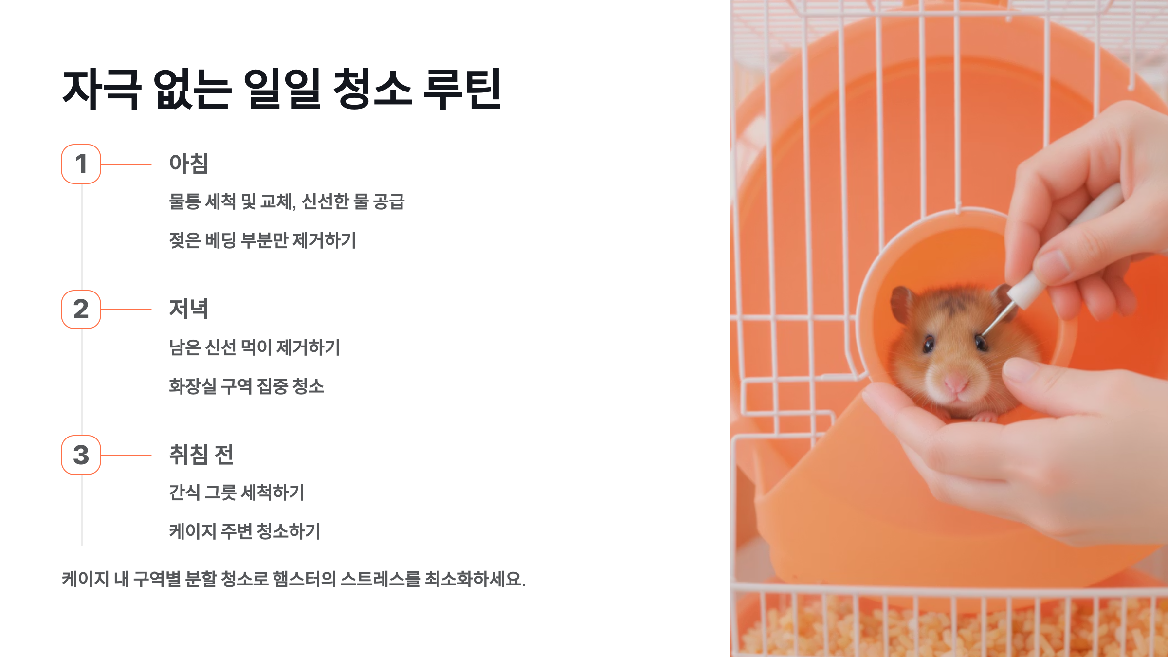 매일 하는 간단한 청소가 큰 냄새를 예방하는 가장 효과적인 방법이에요. 아침에 일어나서 가장 먼저 하는 일은 햄스터의 화장실 모래를 확인하는 거예요. 오줌 덩어리와 똥을 작은 스쿱으로 제거하고, 필요하면 새 모래를 조금 추가해주세요. 이 작업은 5분도 걸리지 않지만 냄새 관리에는 정말 큰 효과가 있어요.