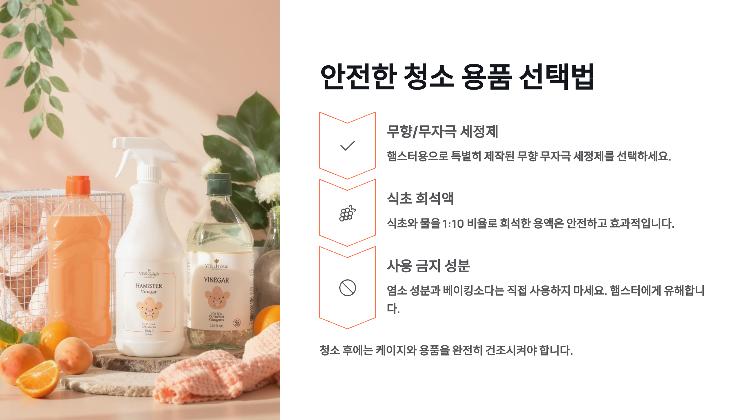 시판 제품을 사용해야 한다면, 소동물 전용 청소제를 선택하세요. 이런 제품들은 햄스터의 민감한 호흡기를 고려해서 만들어졌어요. 사용 후에는 반드시 깨끗한 물로 여러 번 헹구고 완전히 건조시켜야 해요. 잔여물이 남아있으면 햄스터가 그것을 핥거나 흡입할 수 있거든요.