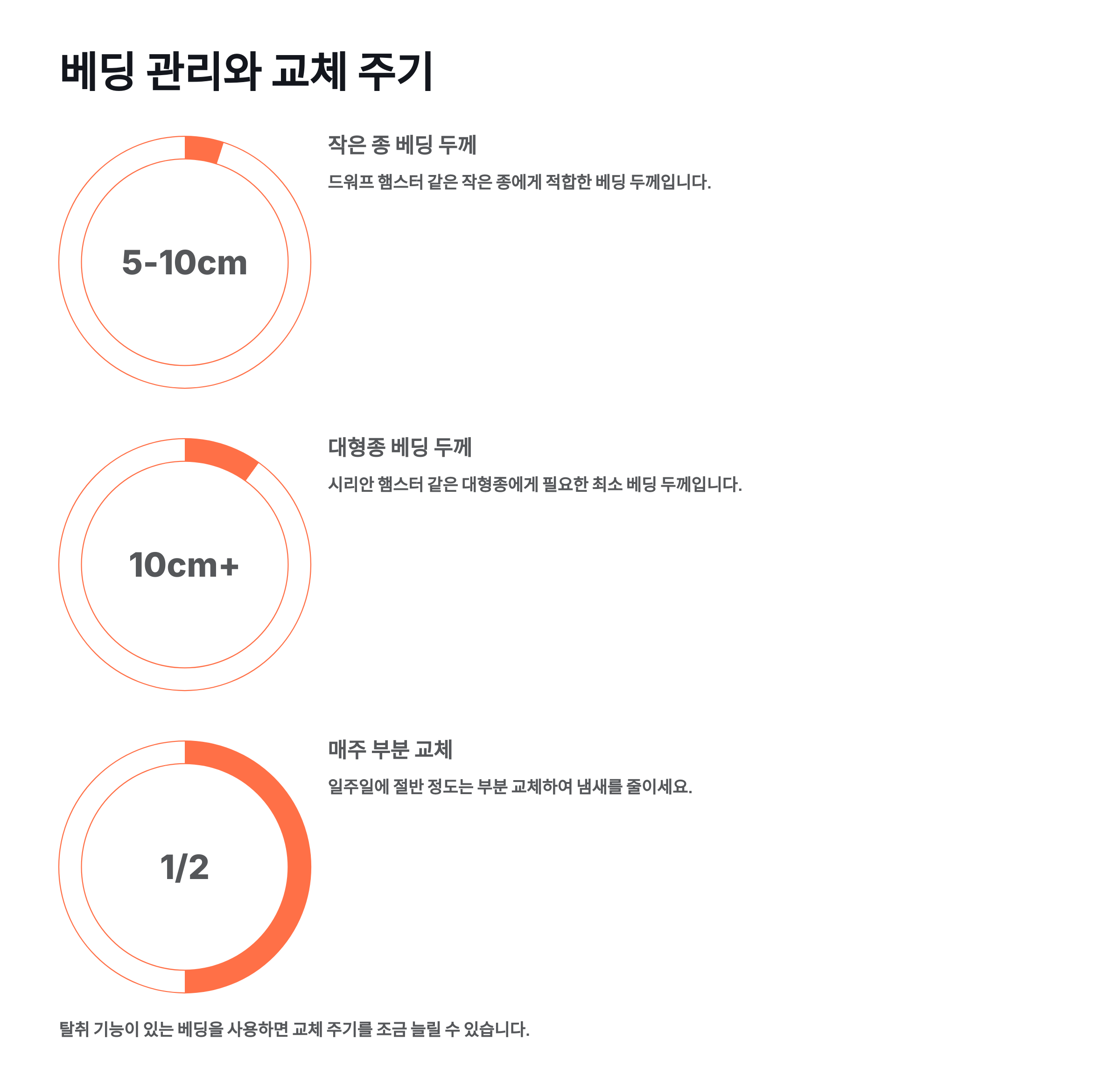 베딩의 깊이도 중요해요. 최소 5-7cm 이상 깔아주어야 햄스터가 굴을 파고 놀 수 있고, 냄새 흡수도 효과적이에요. 너무 얇게 깔면 바닥까지 오줌이 스며들어 냄새가 심해질 수 있어요. 부분 교체는 2-3일마다, 전체 교체는 일주일에 한 번이 적당해요. 하지만 여름철이나 습도가 높은 날에는 더 자주 교체해주는 것이 좋답니다.