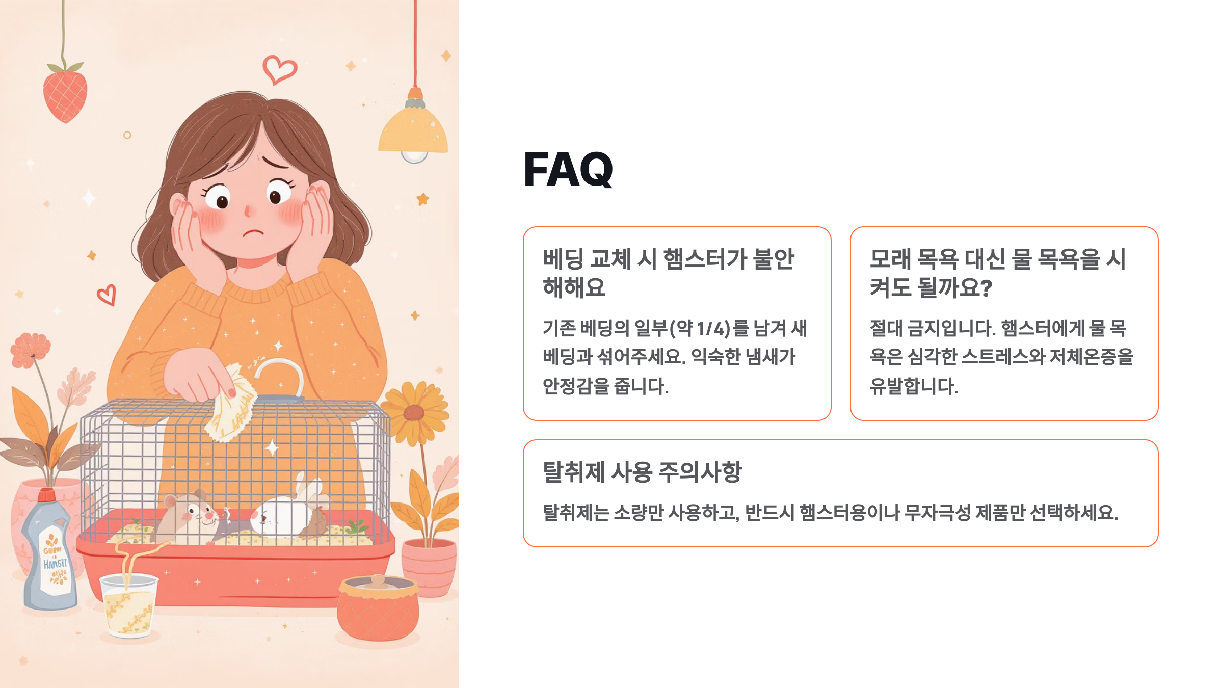 천연 재료를 활용한 안전한 청소법, 체계적인 청소 루틴, 적절한 베딩 관리, 그리고 환경 조성까지 모든 것이 조화를 이룰 때 최상의 결과를 얻을 수 있어요. 무엇보다 햄스터의 건강과 안전을 최우선으로 생각하면서 관리하는 것이 중요해요.