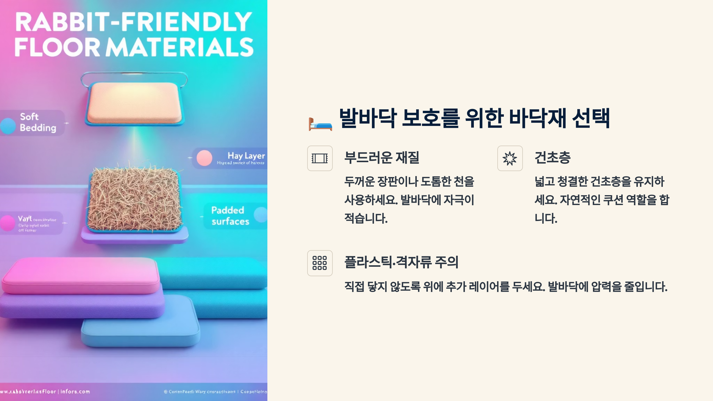 바닥재는 토끼의 건강과 직결되는 요소예요. 단단하거나 미끄러운 바닥은 발바닥에 지속적인 자극을 주고, 염증은 물론 슬개골 탈구, 관절 손상까지 유발할 수 있어요. 그래서 바닥재는 충격 흡수력, 통기성, 세탁 가능성까지 고려해서 선택해야 해요. 🧼🧶