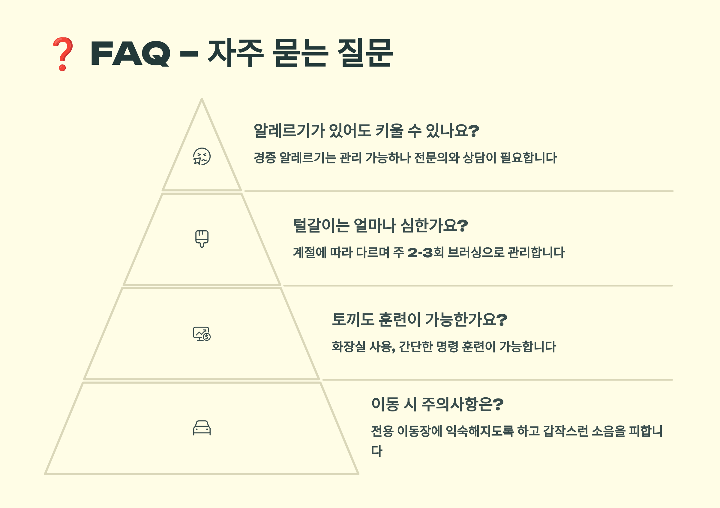 A2. 품종에 따라 다르지만 대부분 계절 털갈이가 있어요. 라이언헤드, 롭 종류는 정기적인 브러싱이 필수예요. 실내에서도 털 날림이 생각보다 많아요 🧼