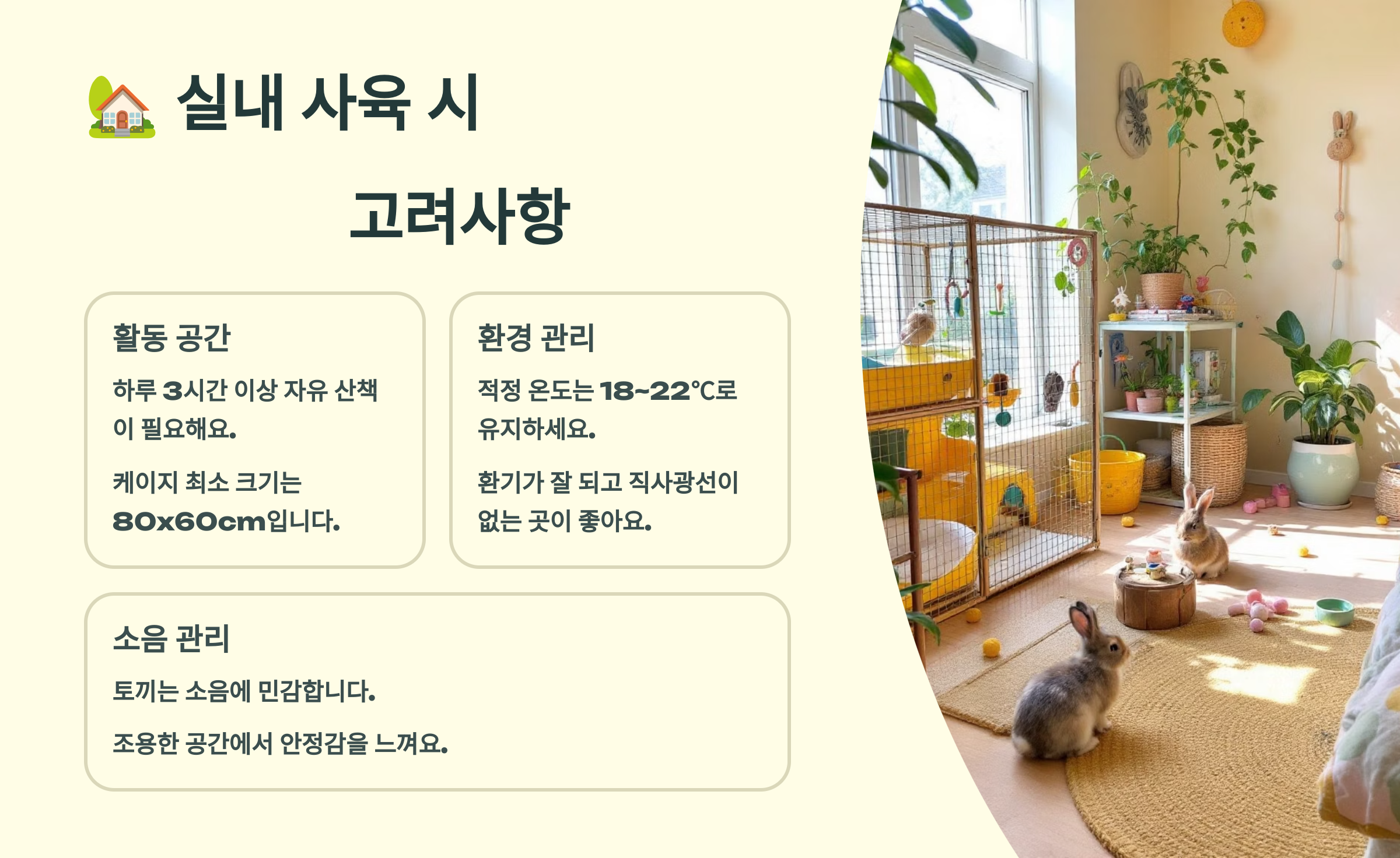 다음 섹션에서는 토끼를 실내에서 키울 때 꼭 고려해야 할 점들을 알려드릴게요! 🏠🐇
