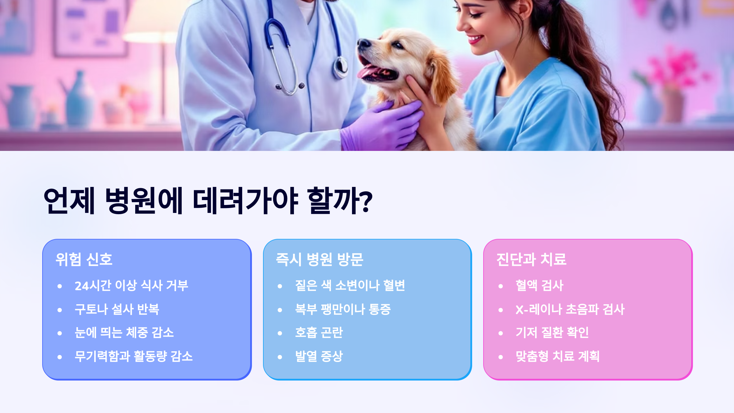 📆 보호자 입장에서 가장 어려운 판단 중 하나가 ‘지금 병원 갈 정도인가?’ 하는 고민이에요. 단순 입맛 문제인 줄 알고 넘겼다가 실제로는 위염, 신장질환 같은 중요한 건강 이상을 놓칠 수 있거든요. 이 섹션에서는 병원 방문이 필요한 경고 사인들을 정리해드릴게요. 🚨
