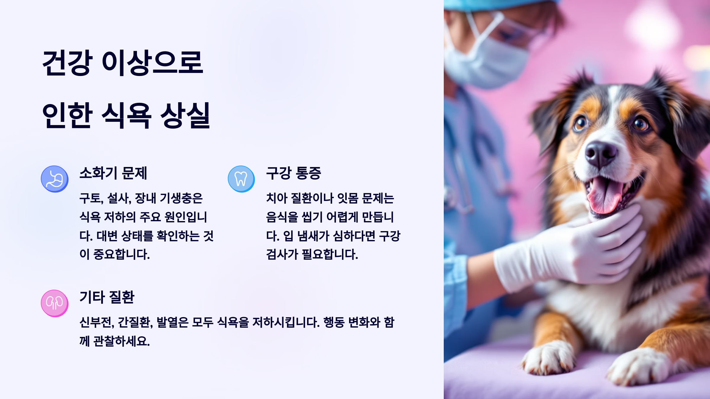 이제 다음 섹션에서는 후각과 입맛의 변화도 밥을 안 먹는 원인일 수 있다는 점, 조금 더 세밀하게 분석해드릴게요! 👃🍽️🐕
